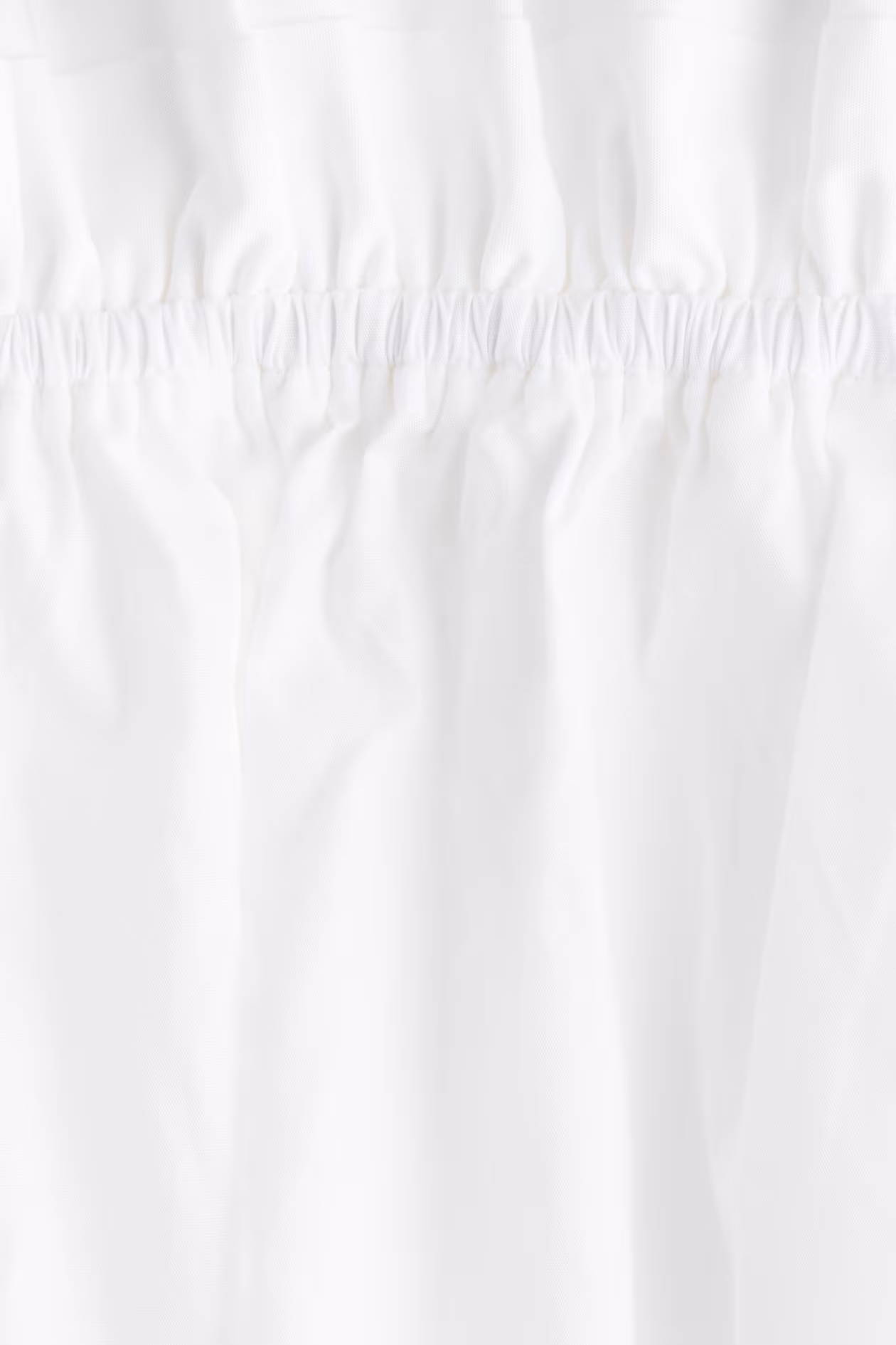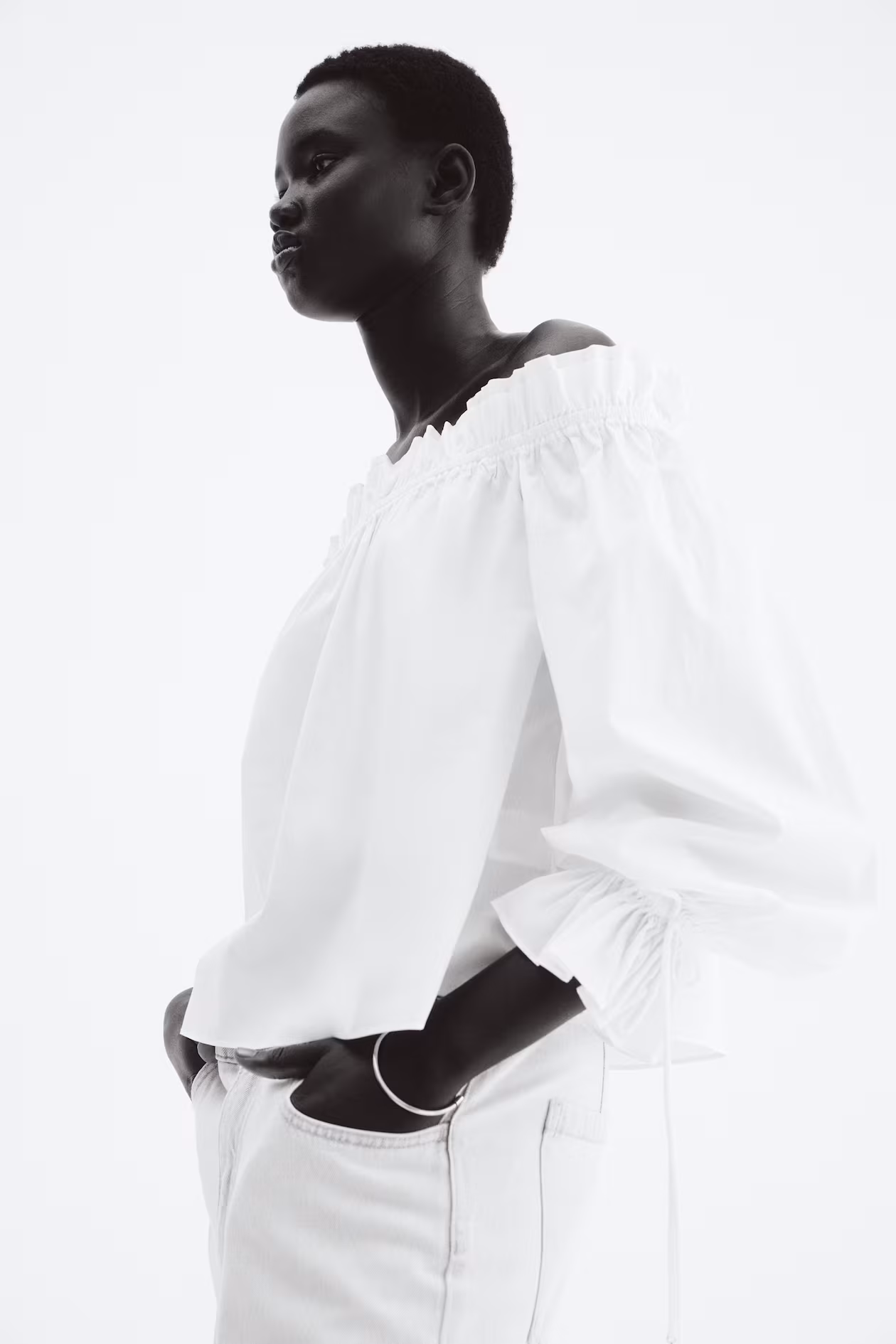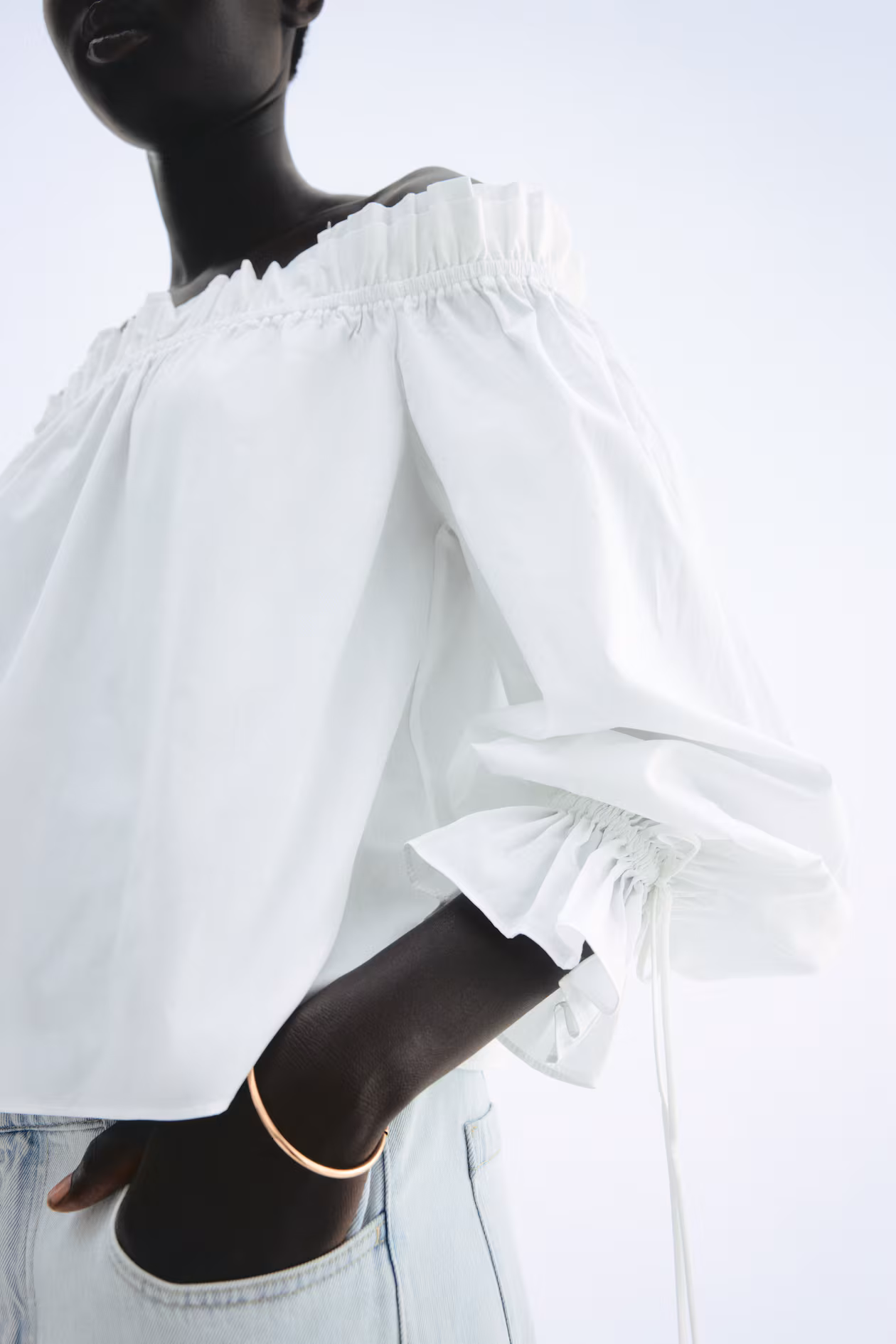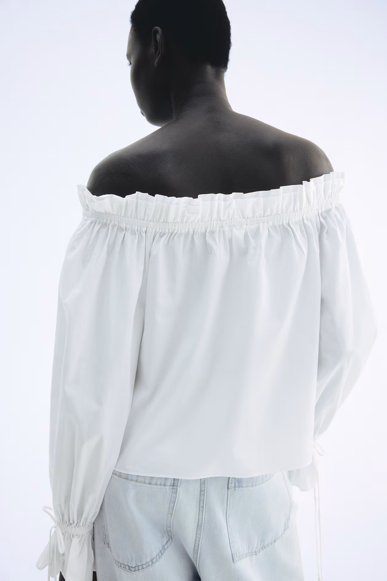 Oversized off-the-shoulder blouse in crisp cotton poplin. Covered elastic and ruffle trim around upper edge. Long sleeves, narrow elastic at wrists, and flared cuffs.