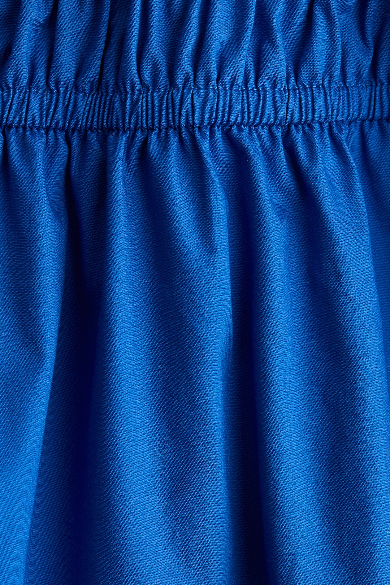 Off-the-shoulder, calf-length dress in crisp cotton poplin. Narrow elastic at upper edge, short puff sleeves with elasticized cuffs, and elastic at waist. Flared skirt. Unlined.