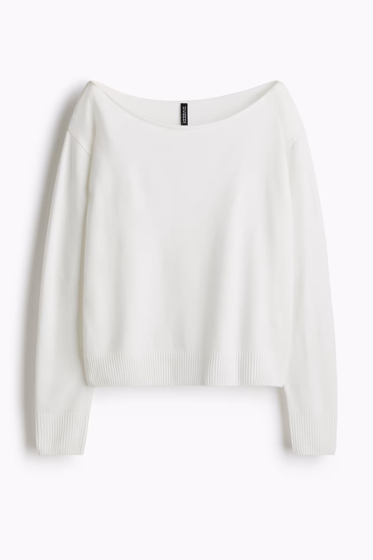 Off-the-shoulder sweater in a soft, fine knit. Neckline with rolled edge, dropped shoulders, and long sleeves. Ribbing at cuffs and hem.