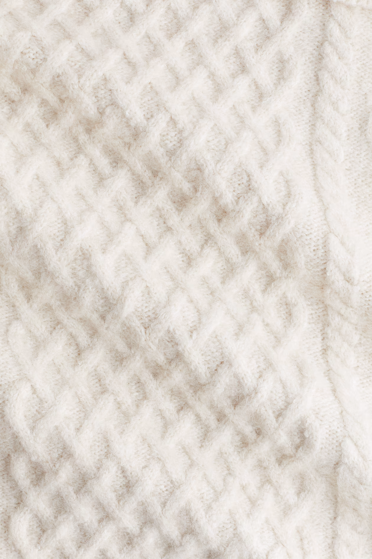 Soft cable-knit sweater with a flat-knit back and wide, rib-knit foldover at upper edge. Long sleeves and ribbing at cuffs and hem.