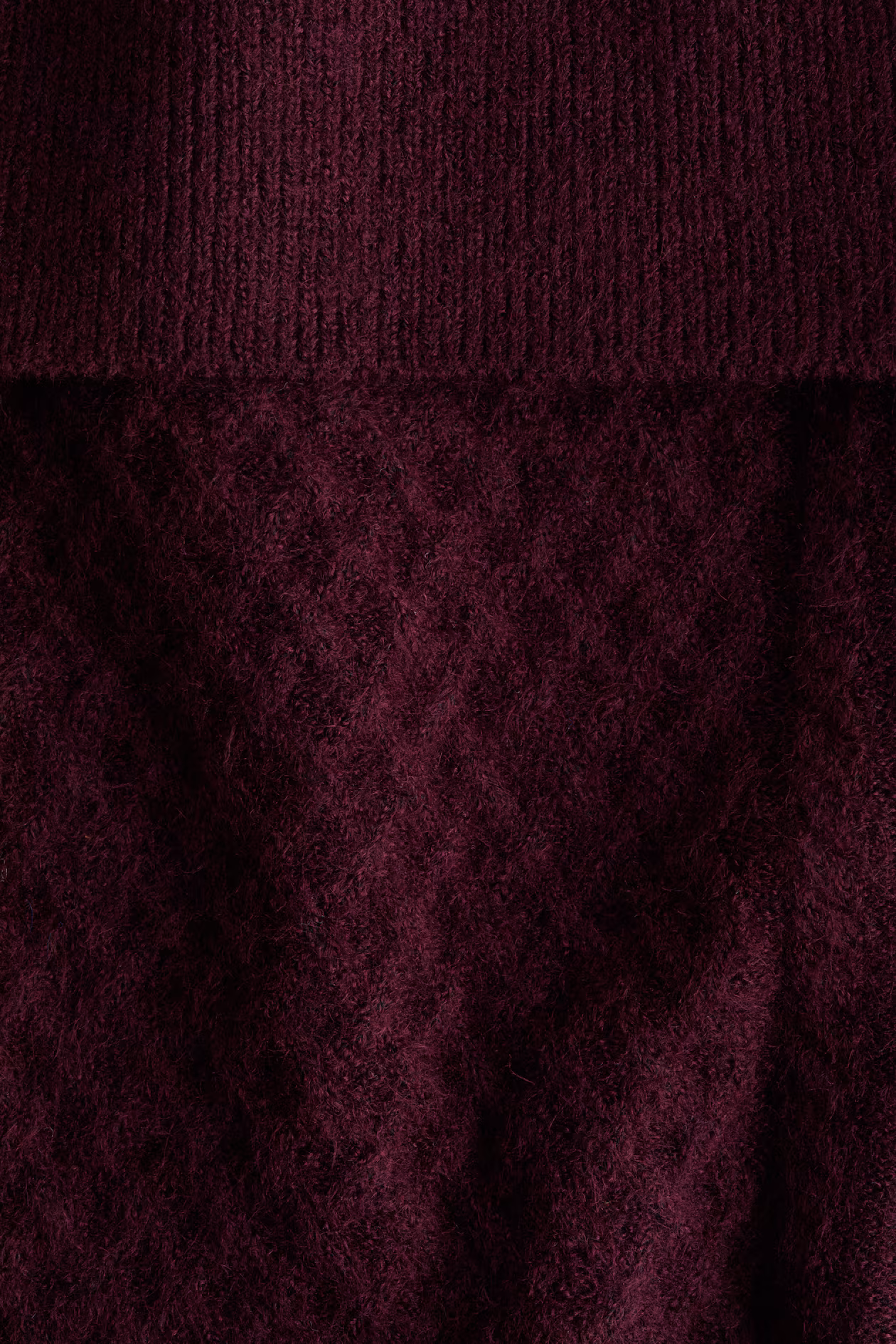 Soft cable-knit sweater with a flat-knit back and wide, rib-knit foldover at upper edge. Long sleeves and ribbing at cuffs and hem.