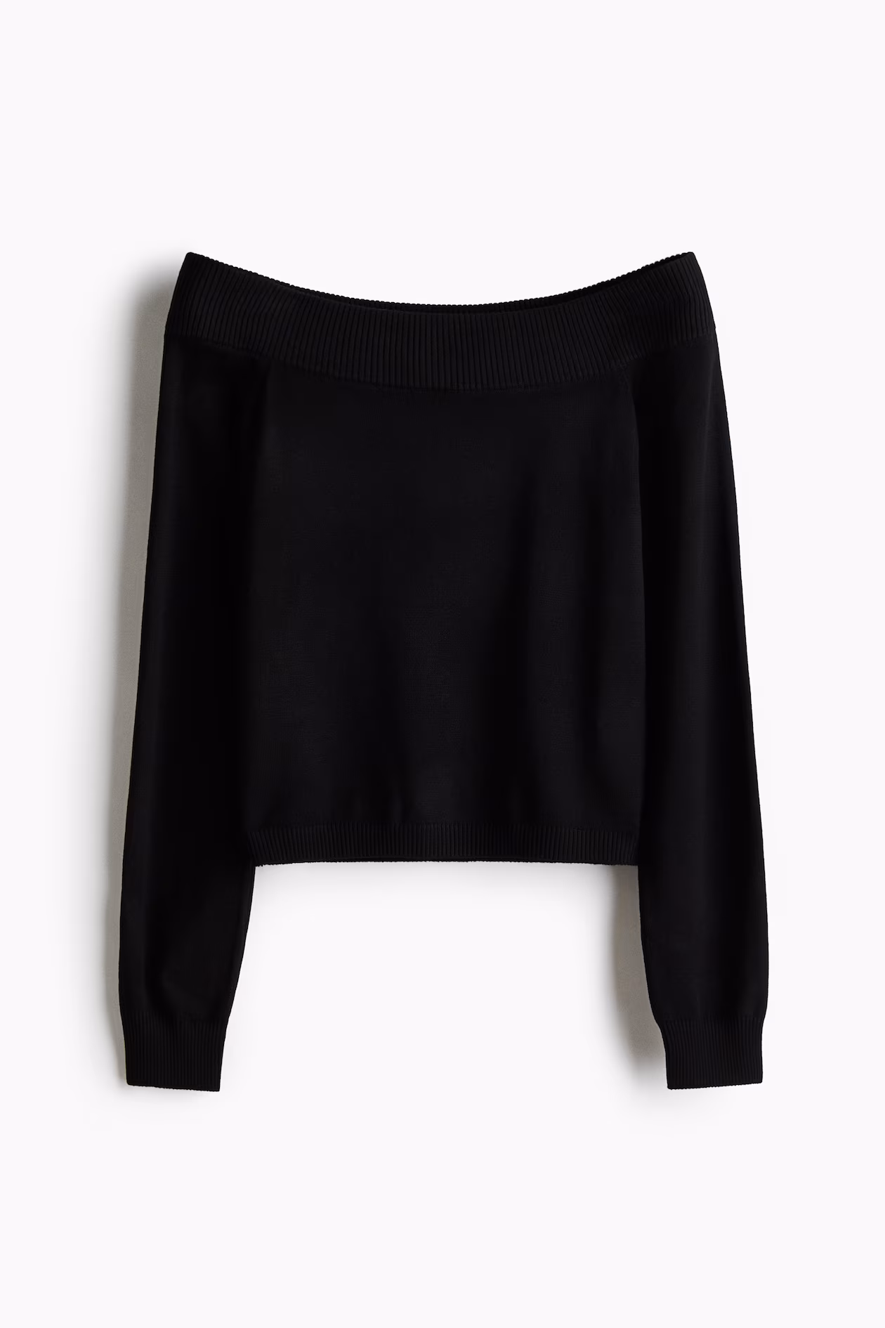 Fitted, long-sleeved off-the-shoulder top in a fine knit. Wide ribbing at upper edge and ribbing at cuffs and hem.