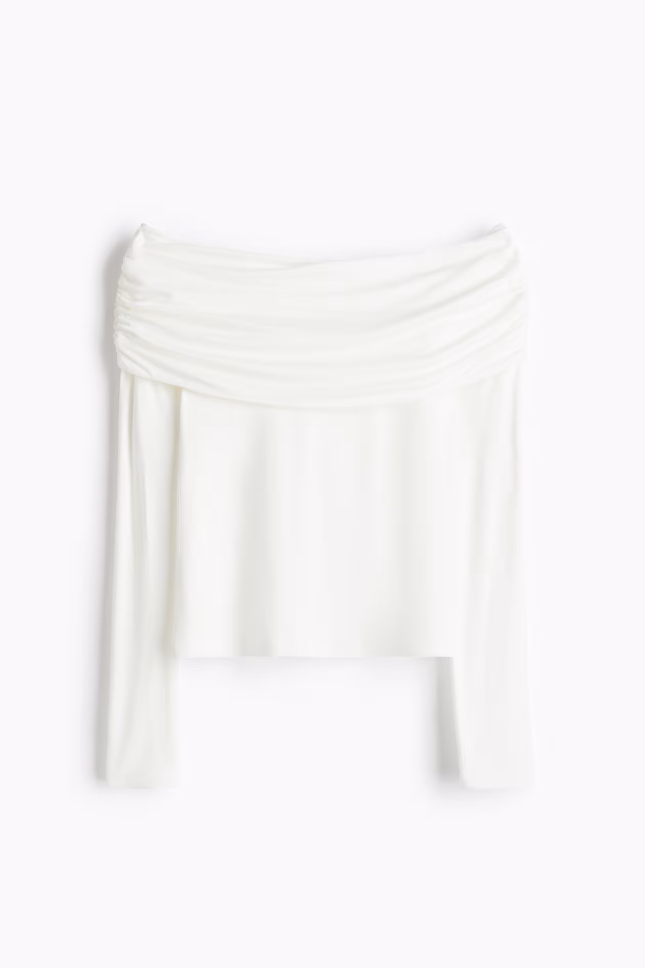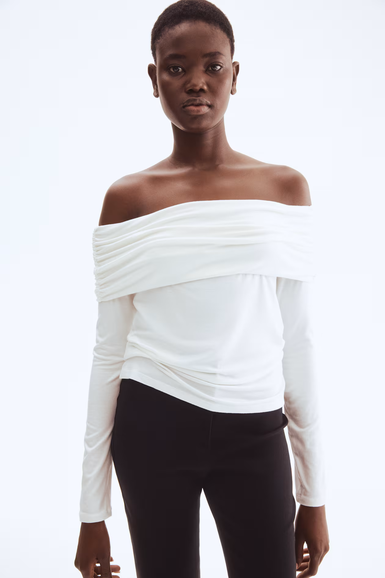 Fitted, off-the-shoulder top in stretch jersey. Wide, foldover upper edge with gathered side seams for a gently draped effect. Long sleeves and raw edges at cuffs and hem.