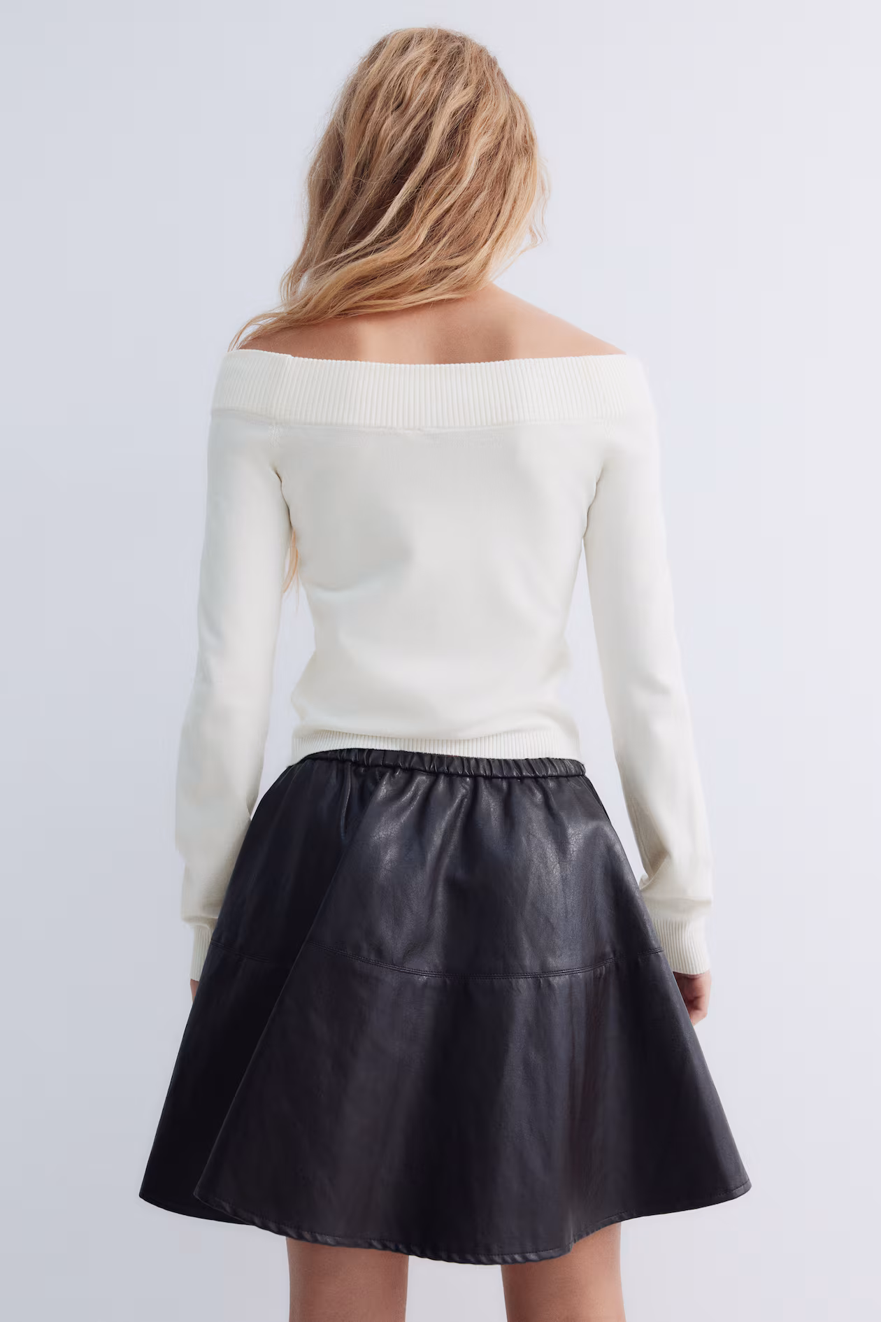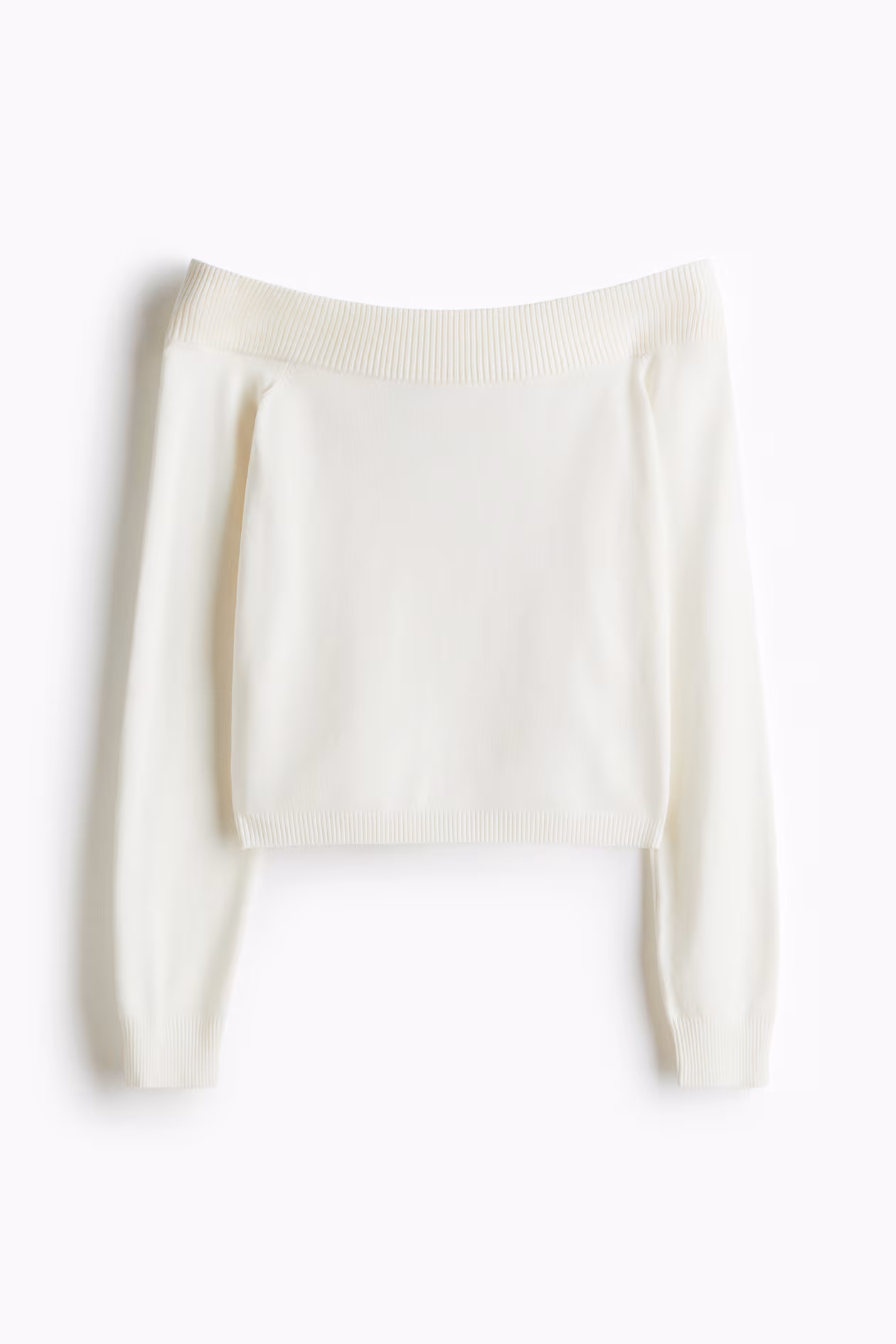 Fitted, long-sleeved off-the-shoulder top in a fine knit. Wide ribbing at upper edge and ribbing at cuffs and hem.