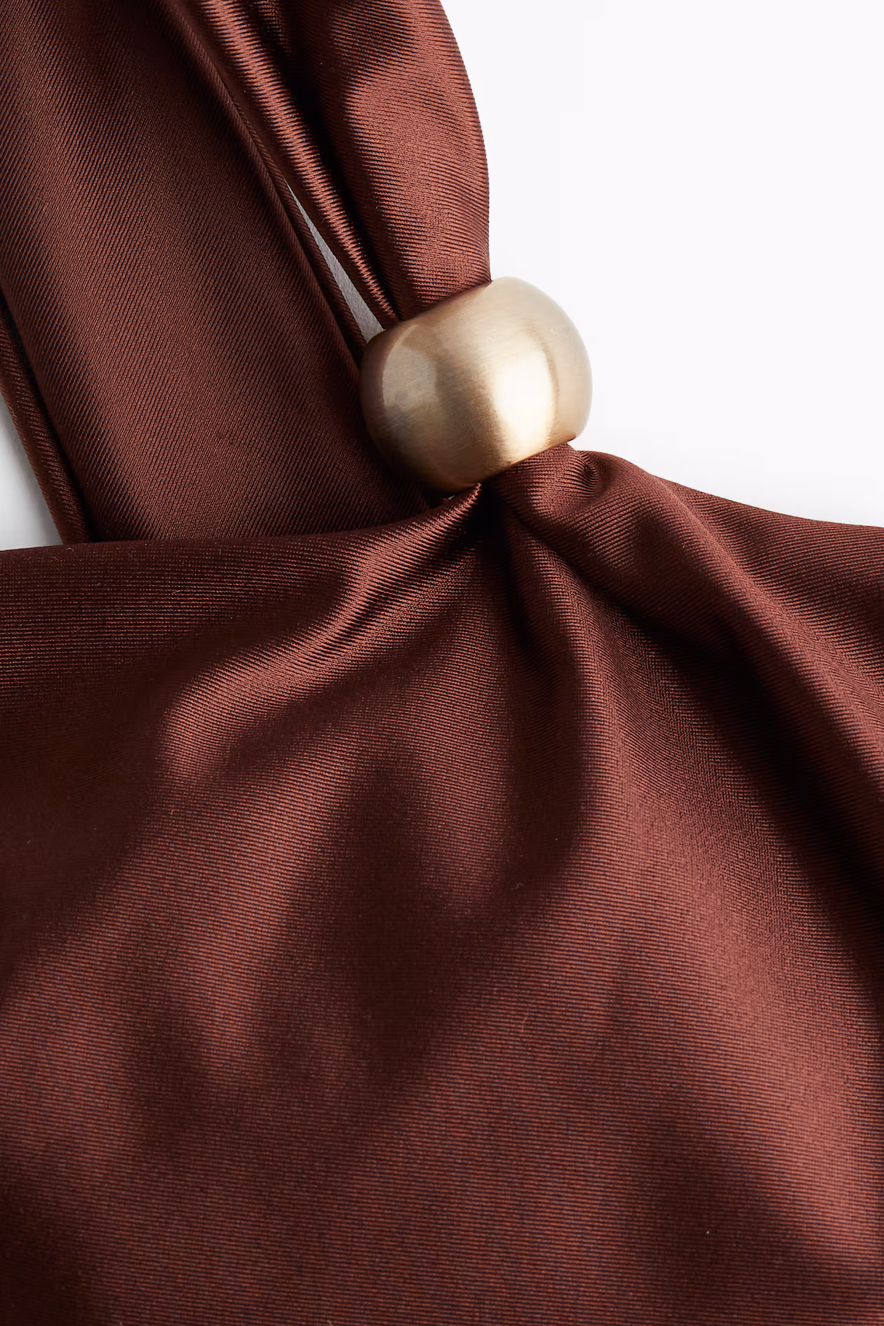 Studio Collection. Fully lined bikini top with a lustrous sheen. One shoulder strap, placed diagonally from center bust to back, threaded through a brushed metal bead at front to create gentle draping. No fasteners.
