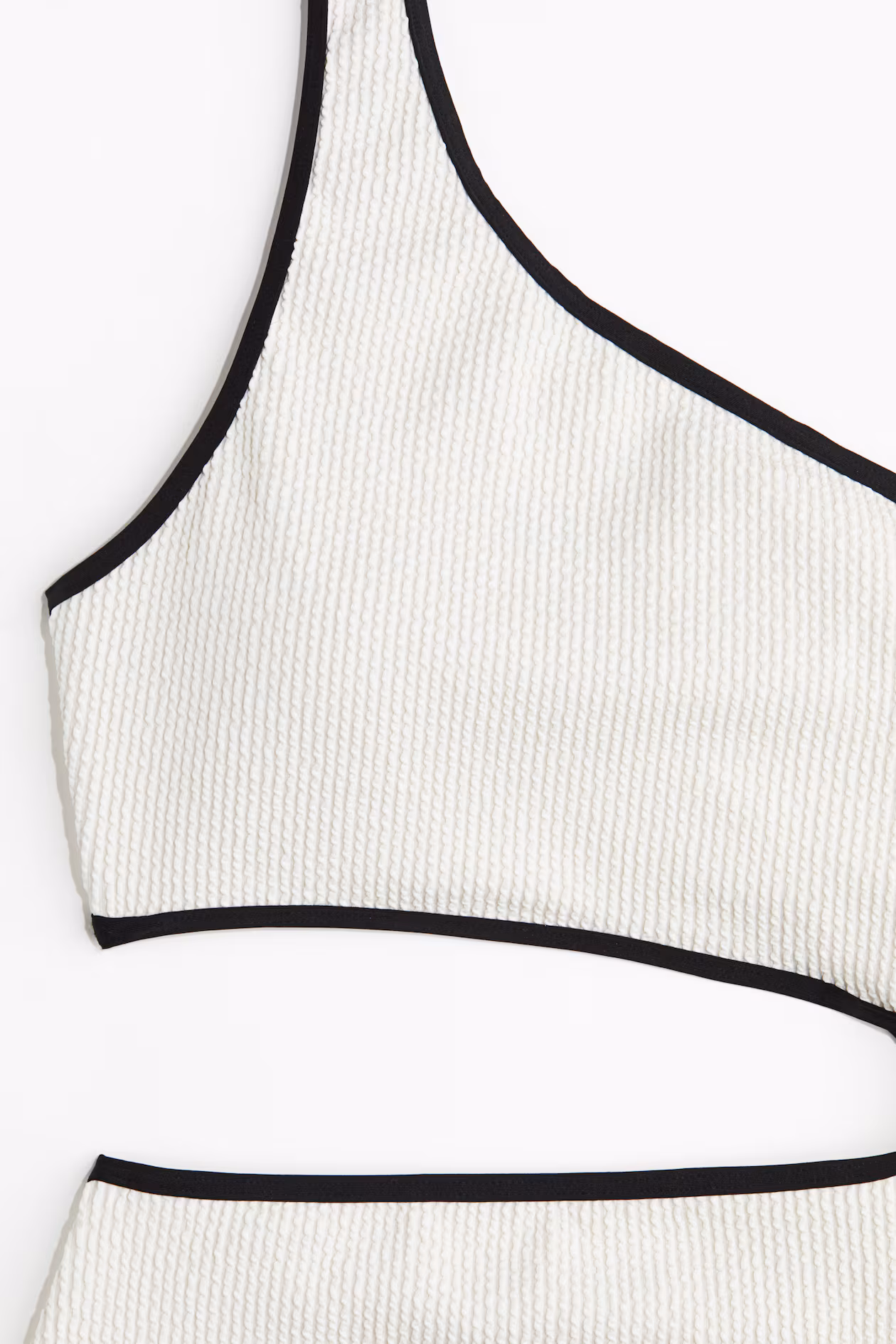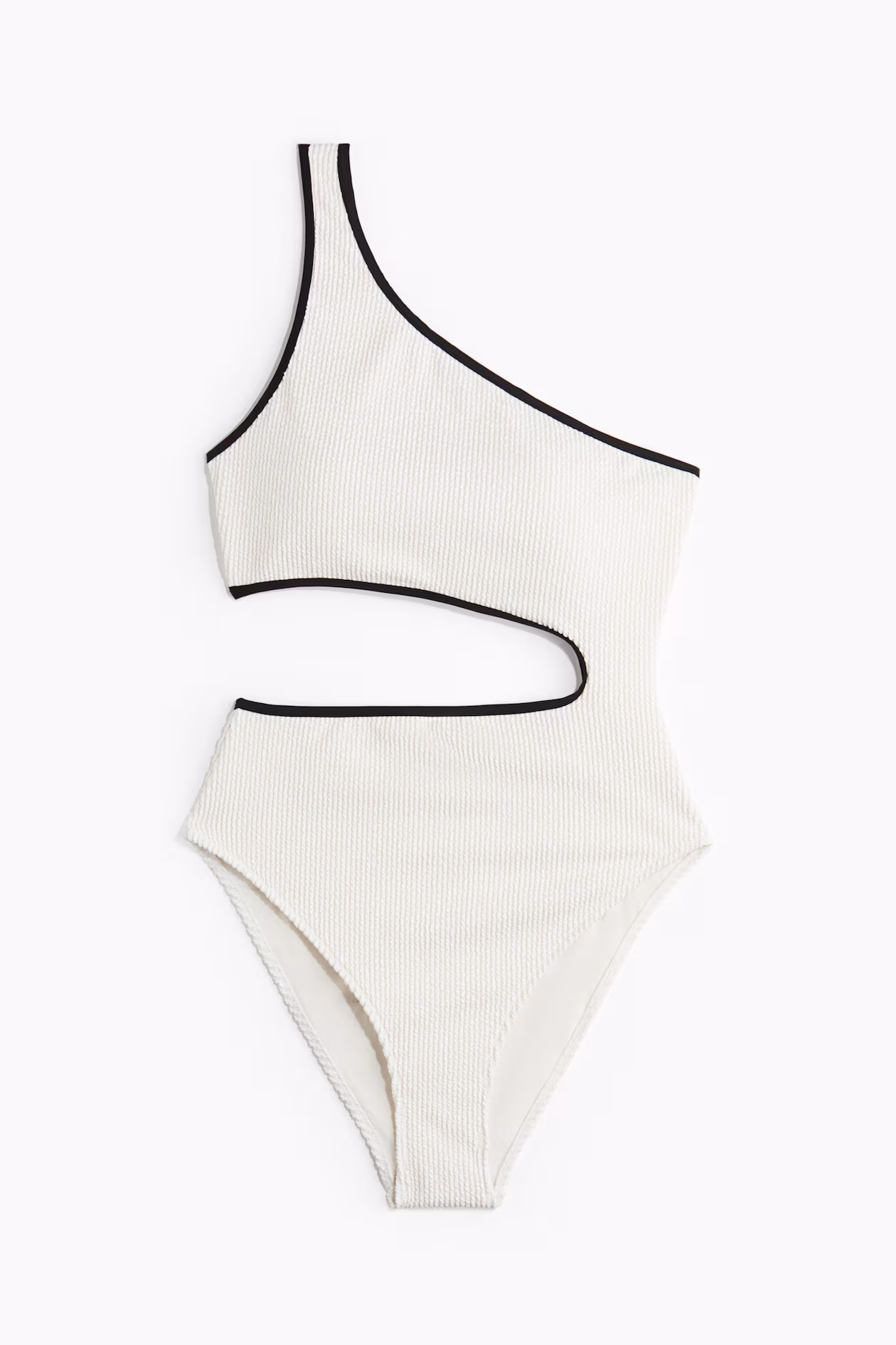 Fully lined, one-shoulder swimsuit with contrasting binding. Cups with removable inserts for shaping and good support, cutout section at waist, and high-cut legs with medium coverage at back.
