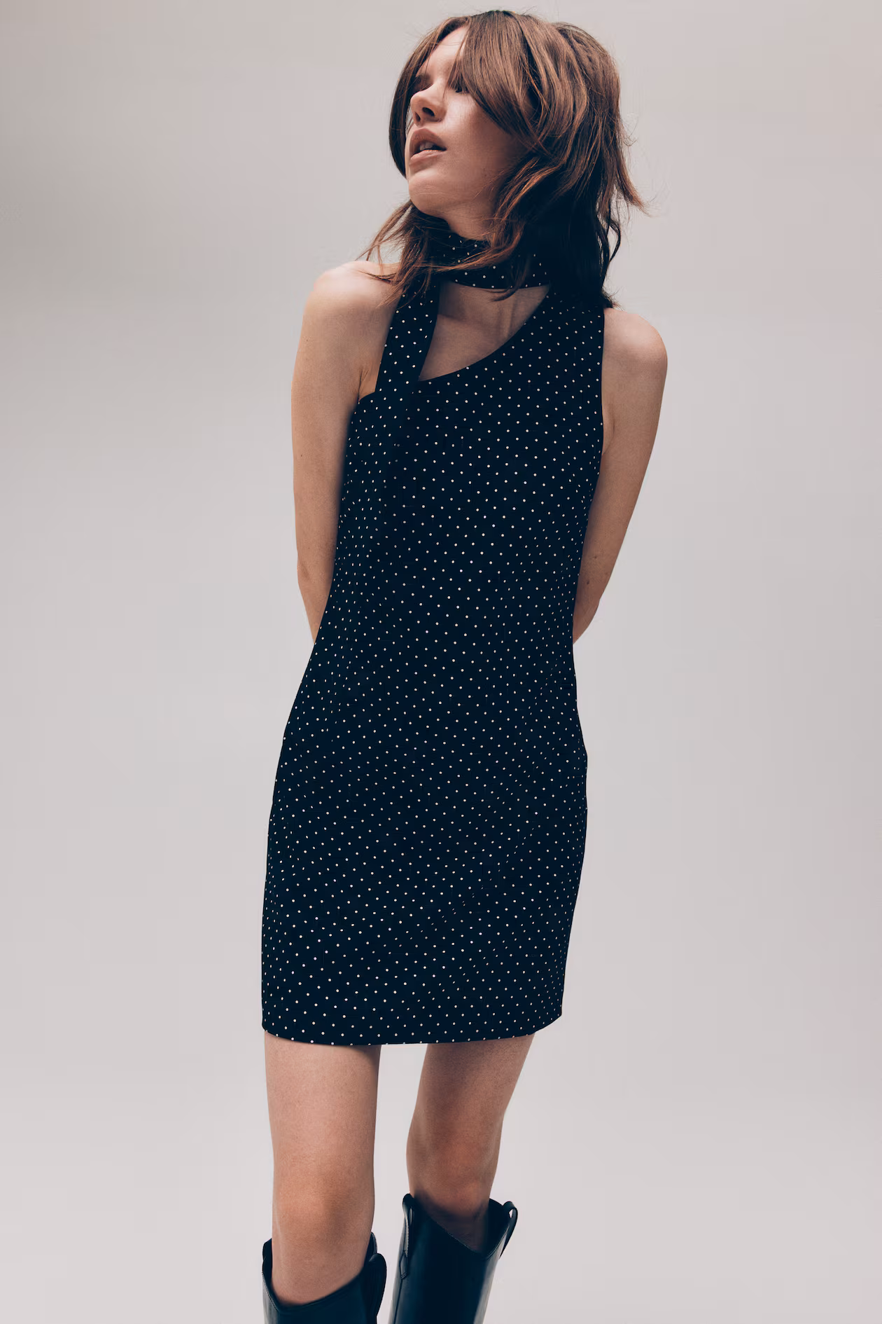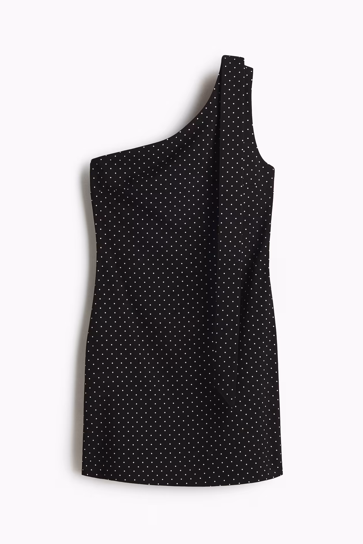 Short, fitted dress in woven fabric. Asymmetric neckline with one shoulder strap and wide ties at neck. Concealed zipper at one side. Lined over bust.