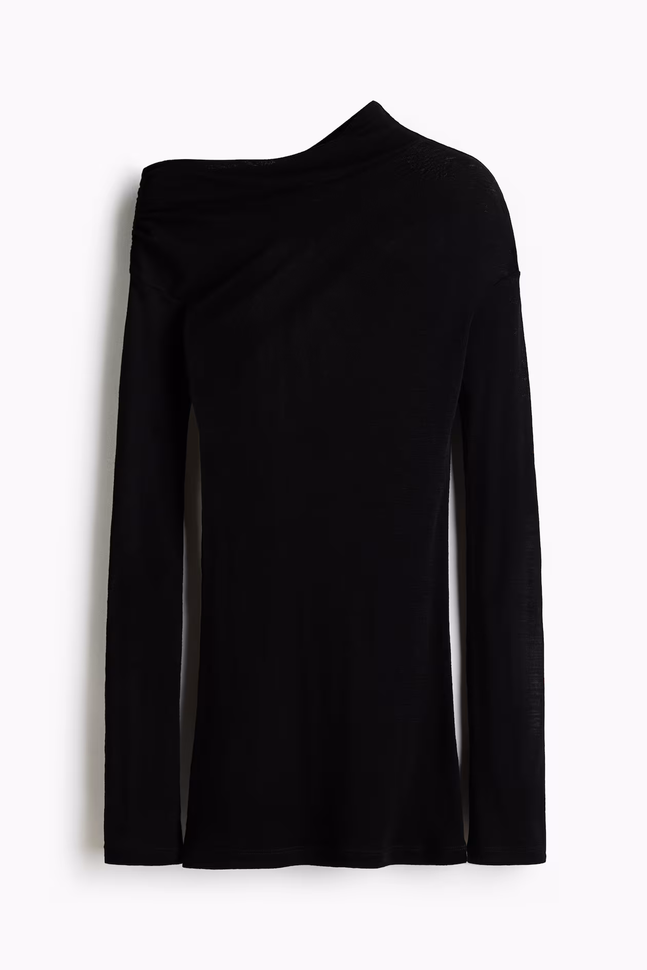 Long, fitted top in fine-knit wool. Draped, one-shoulder neckline and extra-long sleeves.