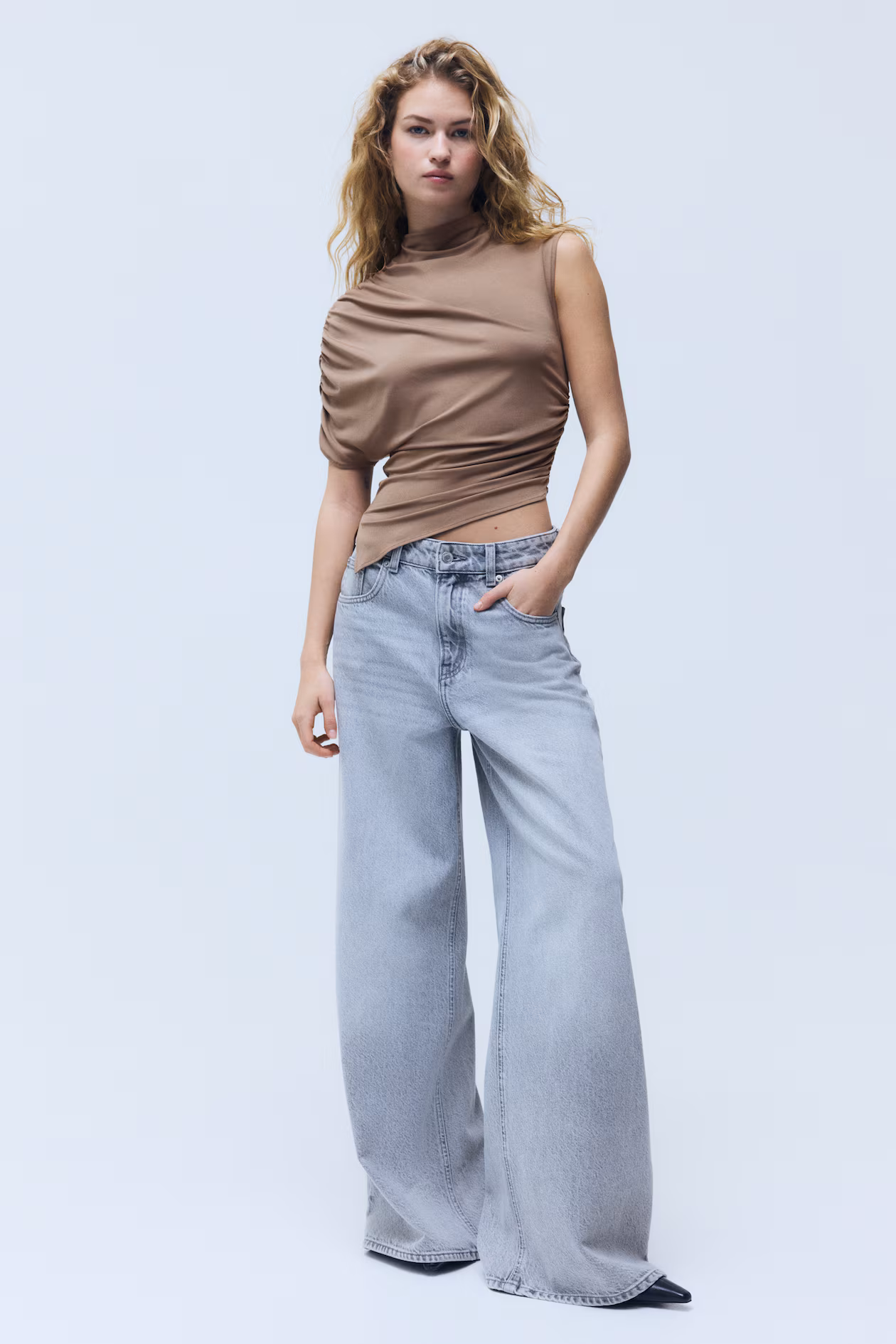 Loose-fit top in jersey with a mock turtleneck. Gathers on one shoulder with a short sleeve and gathers at waist on opposite side for a draped effect. Asymmetric hem with a slit at one side.