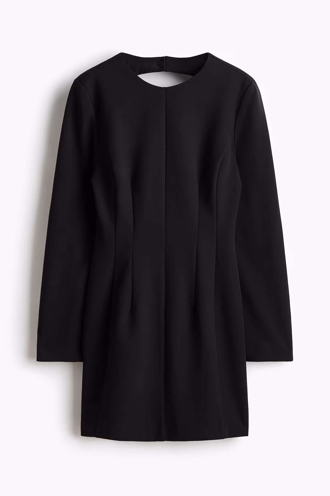 Short, fitted dress in thick woven fabric with shaping seams at front for a flattering silhouette. Round neckline at front and an open back with two covered buttons at back of neck. Concealed zipper at back of waist with hook-and-eye fastener. Gently flared skirt. Partly lined.