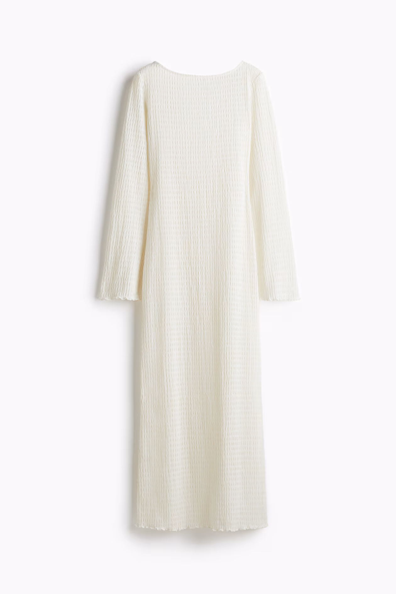 Long dress in textured jersey. Boat neck at front, round, low-cut back, and long sleeves. Overlocked edges at cuffs and hem.