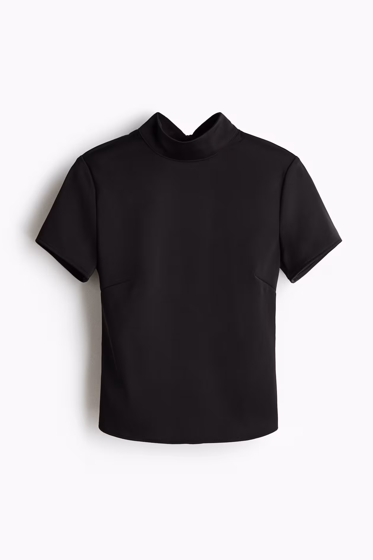 Short-sleeved top in woven fabric with a slight sheen. Stand-up collar, bow appliqué and concealed hook-and-eye fastener at back, and an open section at back. Concealed zipper at one side.