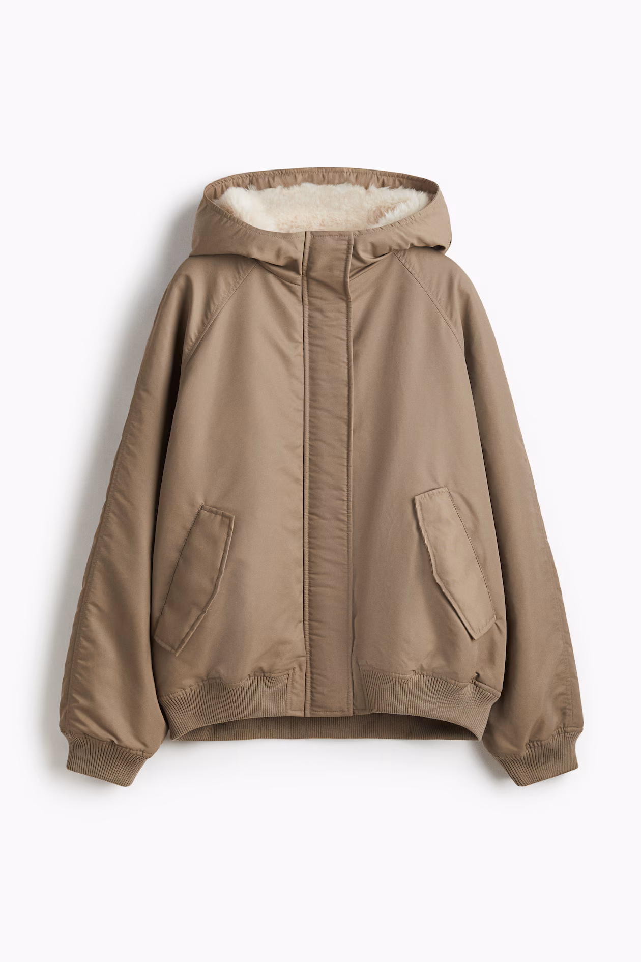 Oversized, lightly padded bomber jacket in nylon. Fluffy-lined hood, zipper at front with wind flap and concealed snap fasteners, and side pockets with flap and concealed snap fastener. Long raglan sleeves and ribbing at cuffs and hem. Lined.
