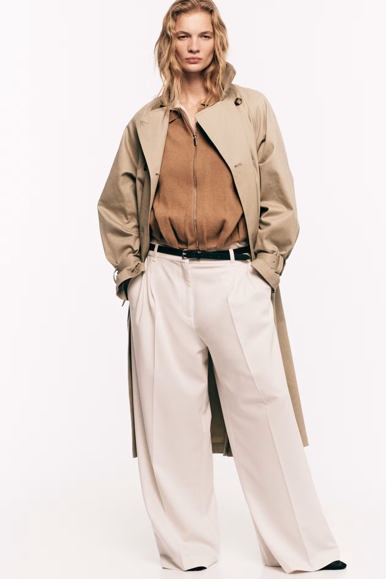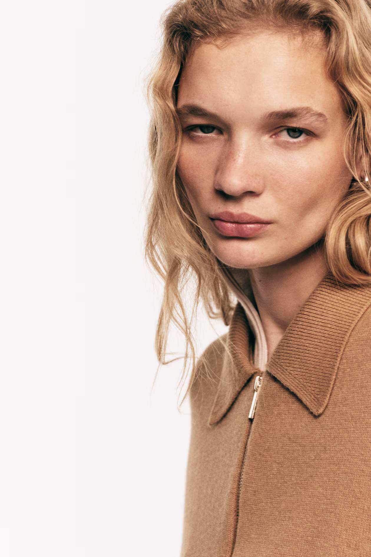 Oversized cardigan in a soft, fine knit. Collar, zipper at front, dropped shoulders, and long sleeves with ribbed cuffs. Pleats at hem.