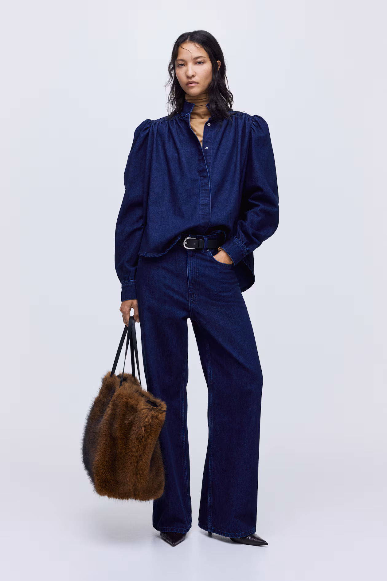 Oversized blouse in cotton denim. Stand-up collar, concealed snap fasteners at front, and a yoke with gathers at front and back. Long puff sleeves with a slit and concealed snap fastener at cuffs. Curved hem.