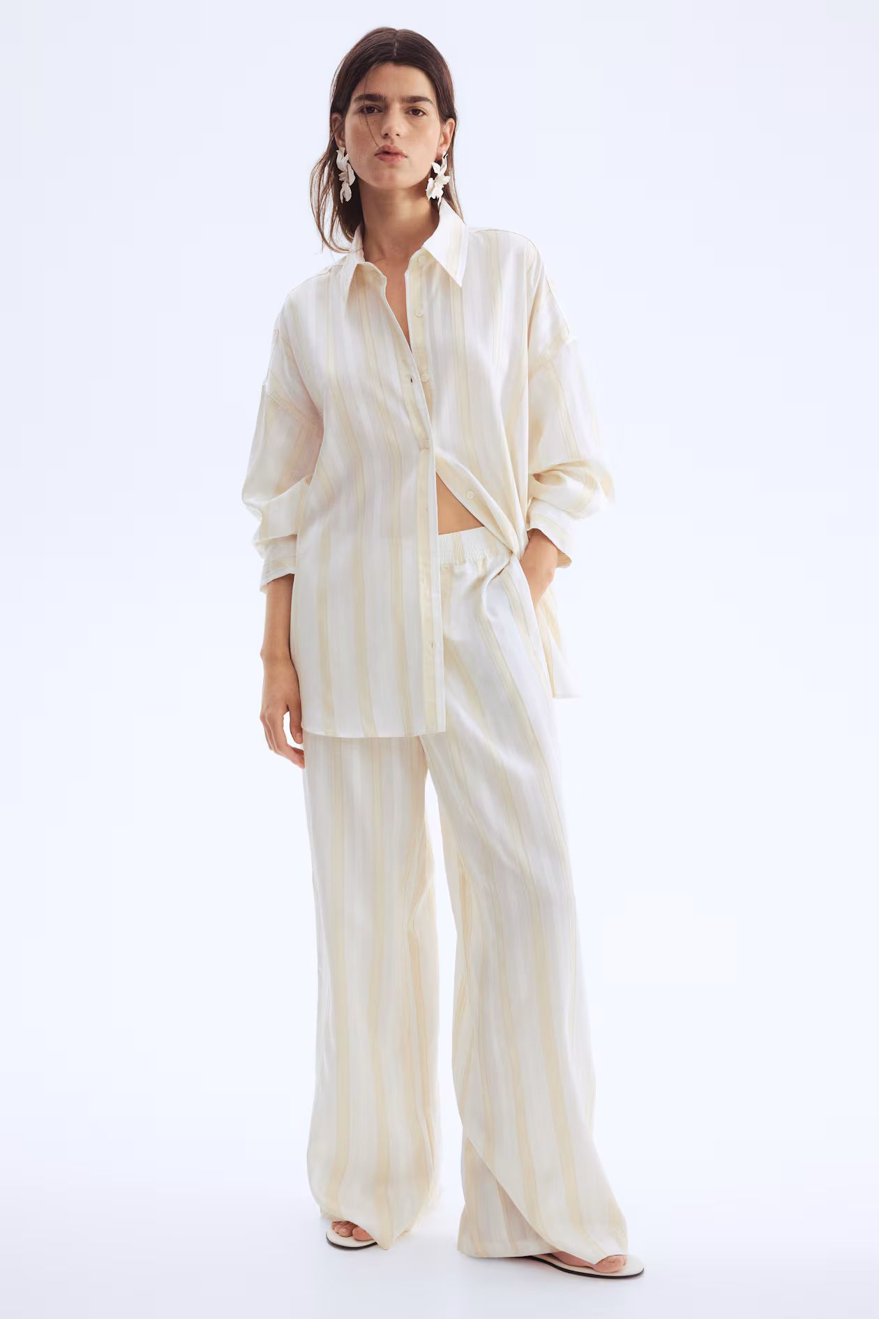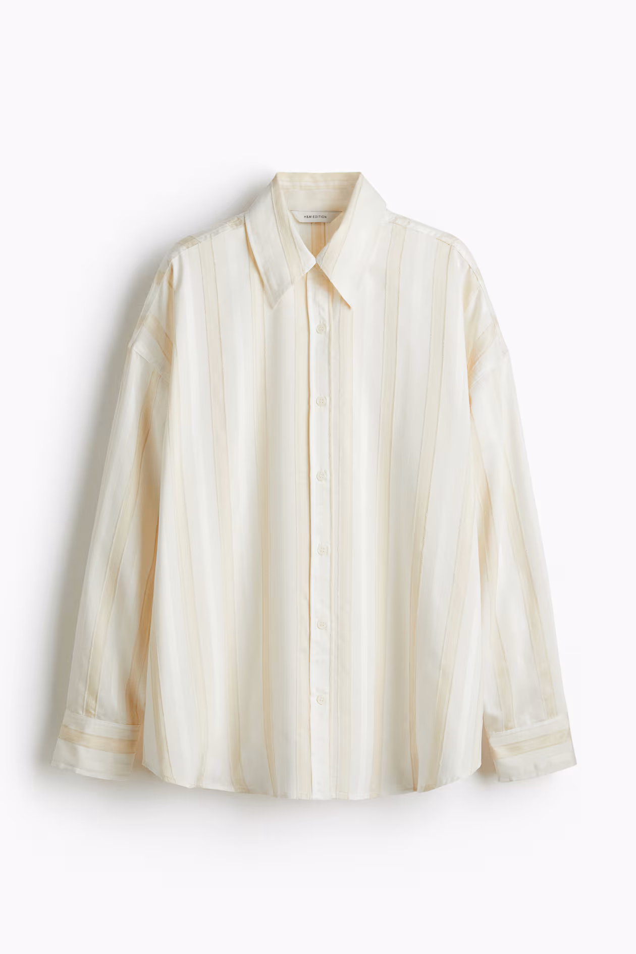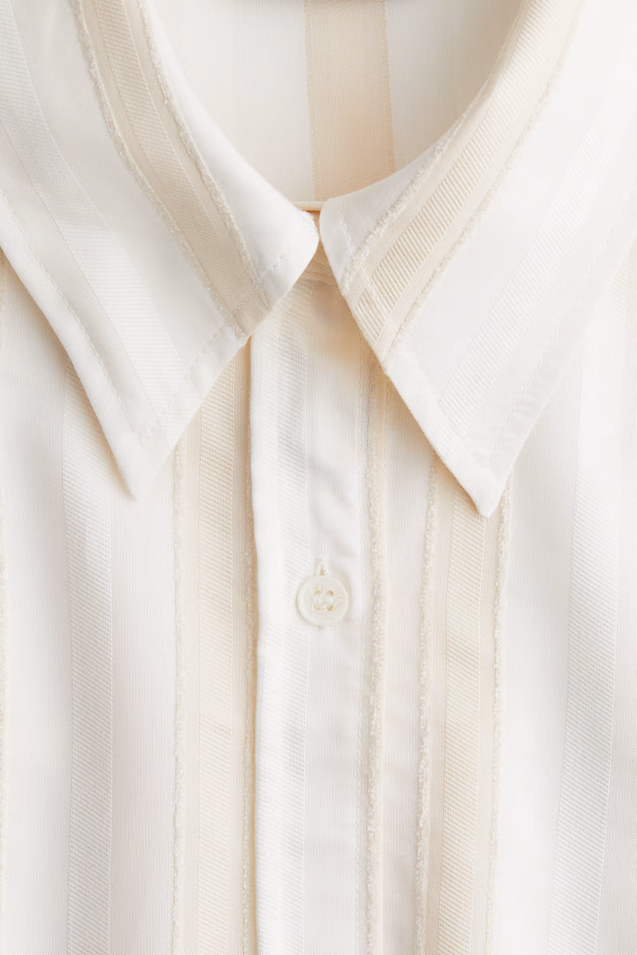 Oversized shirt in dobby-weave fabric. Collar, buttons at front, and a yoke at back. Dropped shoulders and long sleeves with button at cuffs. Gently rounded hem.