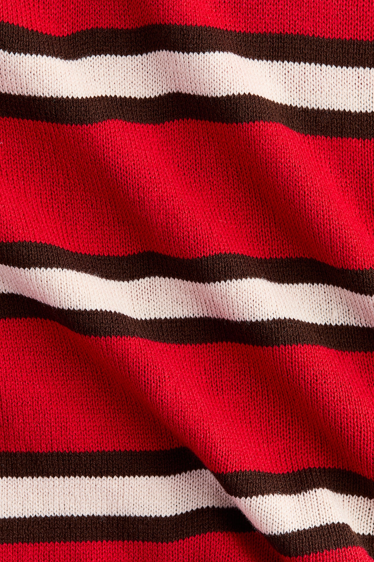Oversized, fine-knit polo shirt with an open collar, heavily dropped shoulders, and elbow-length sleeves. Narrow trim at cuffs and hem.