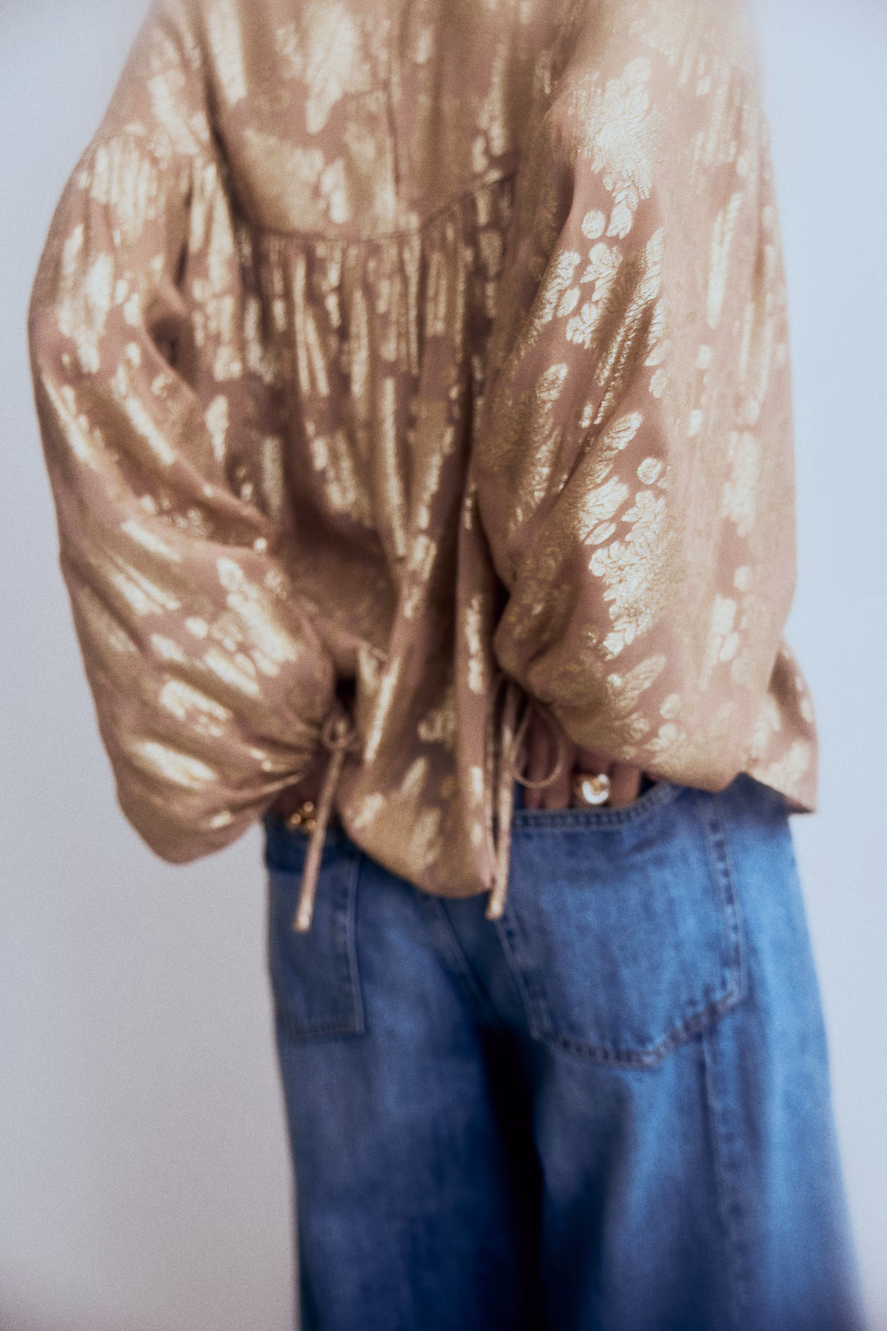 Oversized blouse in a jacquard weave made from a viscose blend with a shimmering pattern. Round neckline, a keyhole opening with a button at the back and a gathered seam at the top for added volume. Long, voluminous sleeves with narrow binding and ties at the cuffs.