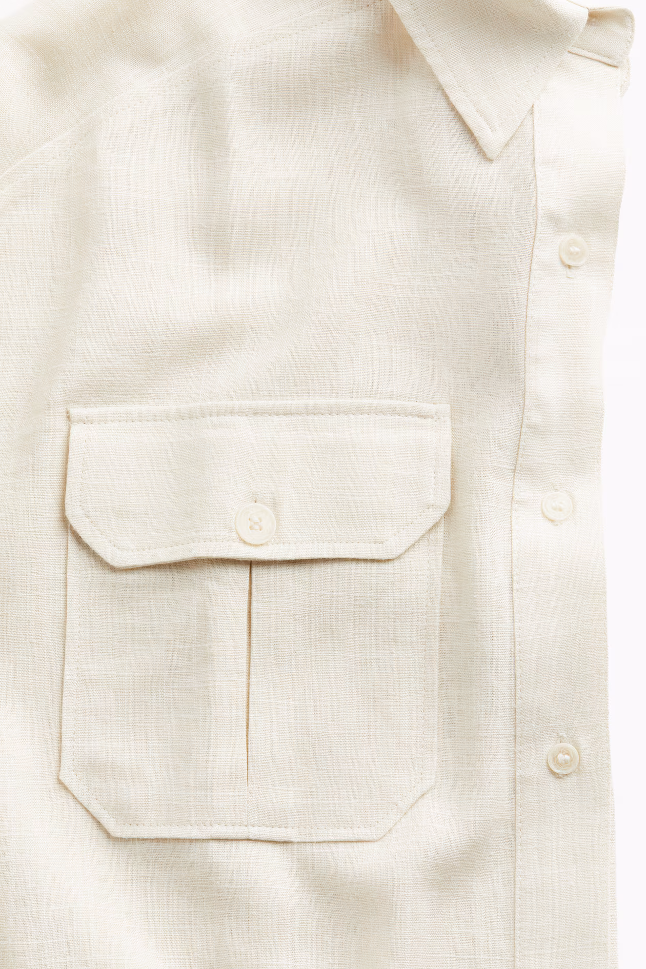 Oversized shirt in an airy, woven linen and viscose blend. Collar, buttons at front, pleat-detail chest pockets with flap and button, and a yoke at back. Forward-facing shoulder seams, heavily dropped shoulders, and long sleeves with button at cuffs. Gently rounded hem.