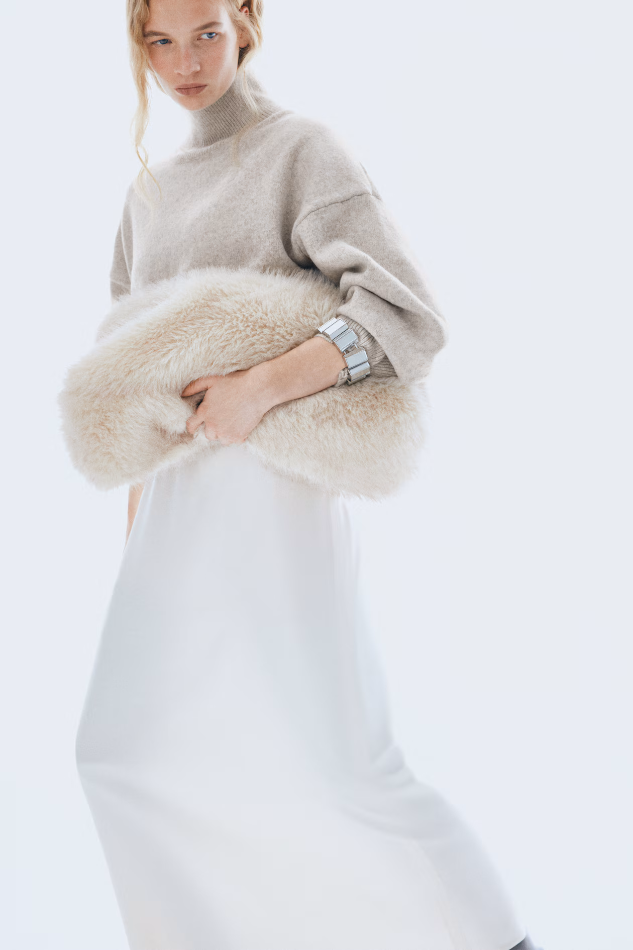 Oversized sweater in a soft knit. Mock turtleneck with a slit and metal button at back. Dropped shoulders, long sleeves, and ribbing at neck, cuffs, and hem.