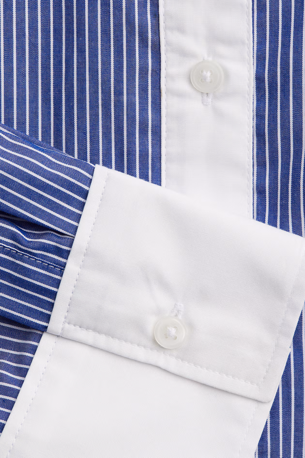 Oversized shirt in crisp cotton poplin. Collar, buttons at front, and a yoke at back. Gently dropped shoulders, long sleeves, sleeve placket with link button, and button at cuffs. Straight-cut hem with curved side vents.