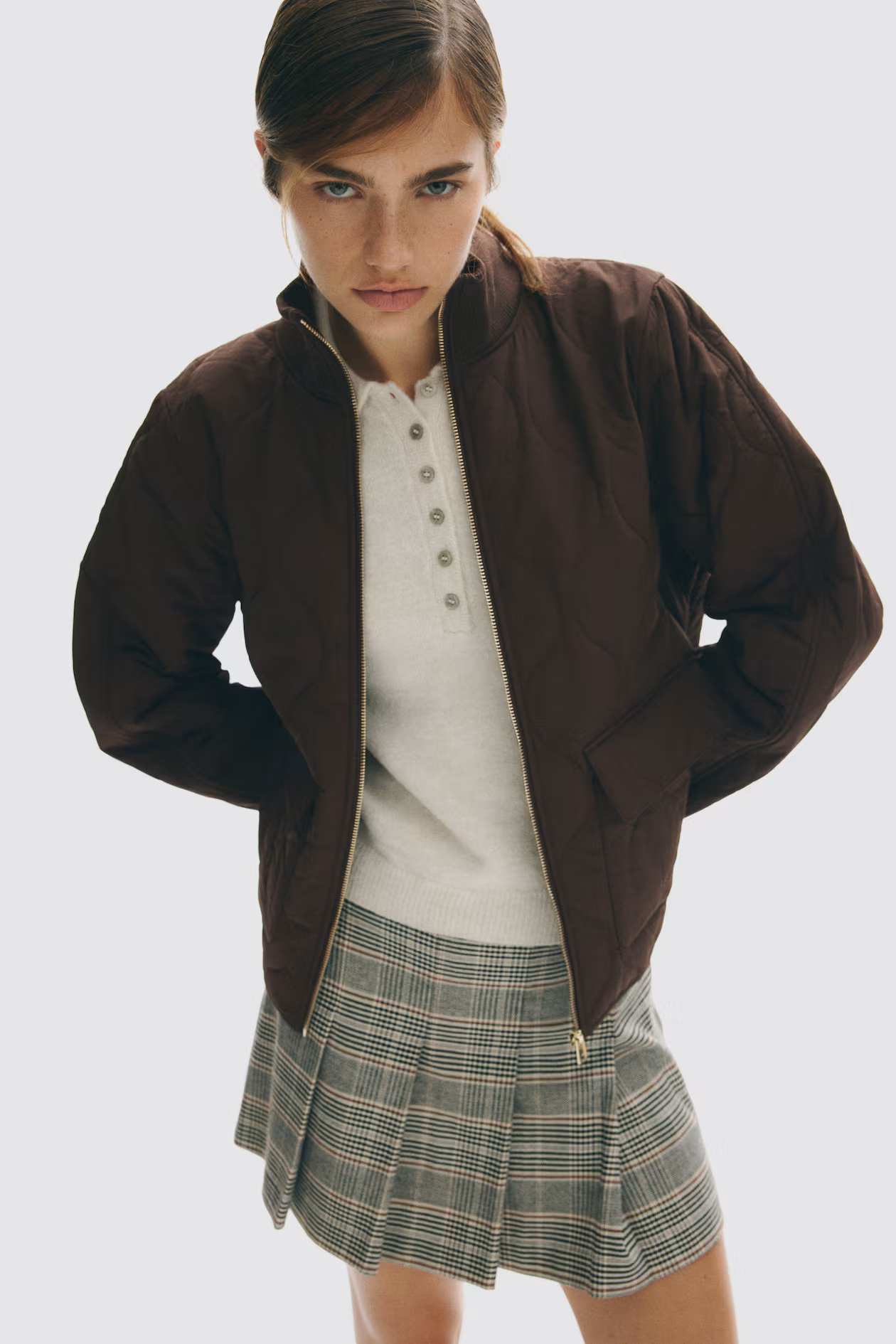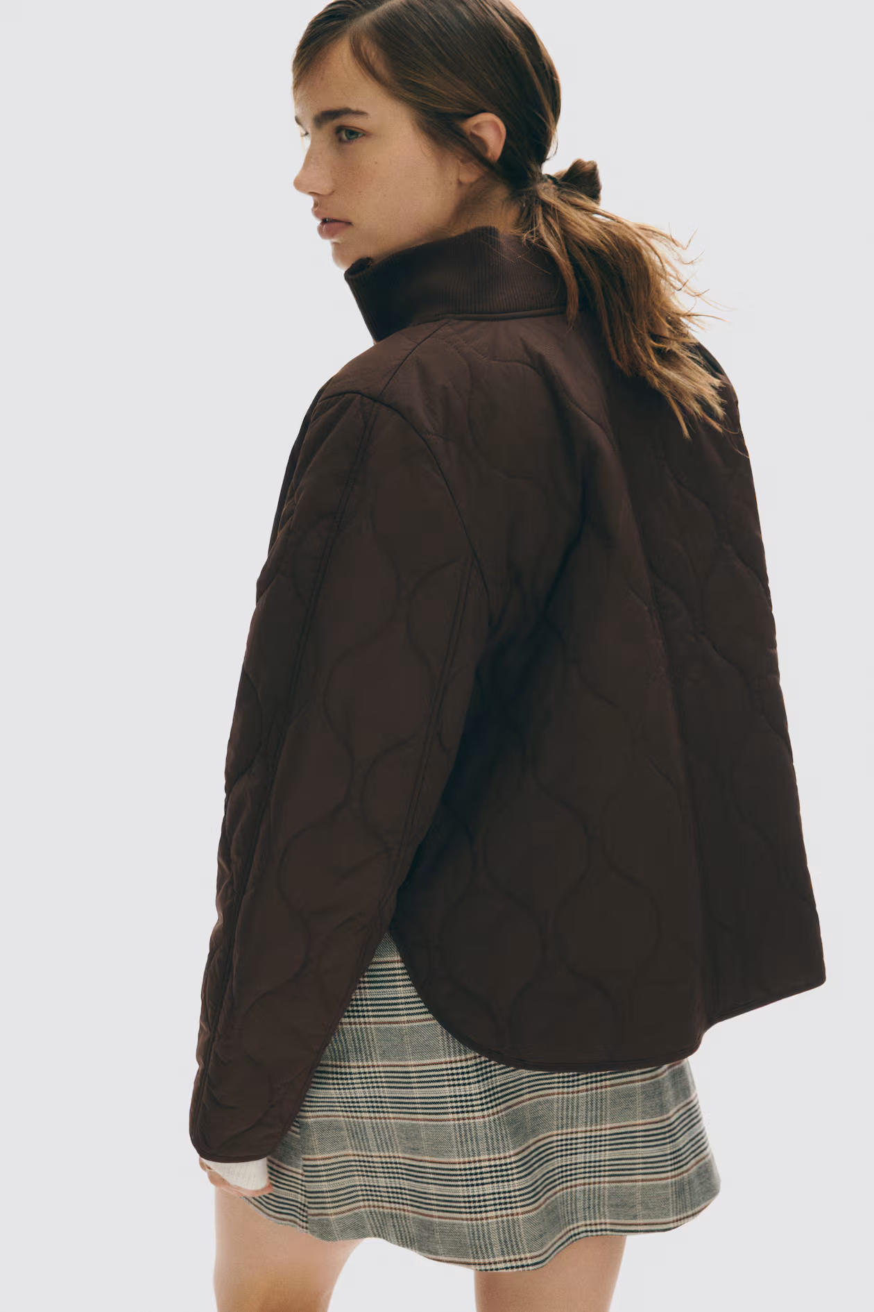 Oversized, lightly padded jacket in quilted nylon. Ribbed stand-up collar, zipper at front, and patch front pockets with flap. Straight-cut hem with curved side vents. Lined.