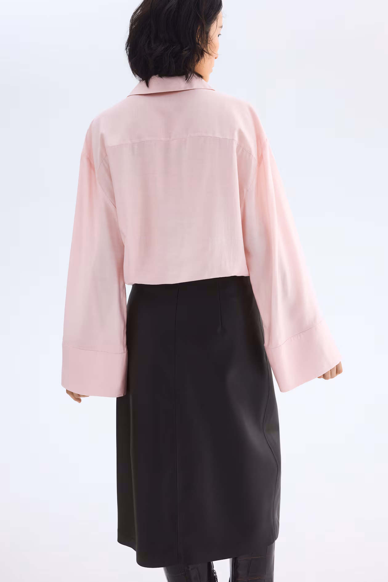Long, oversized shirt in a woven viscose blend. Collar, concealed buttons at front, and a yoke at back. Dropped shoulders, long sleeves with cuffs, and straight-cut hem with a slit at sides.