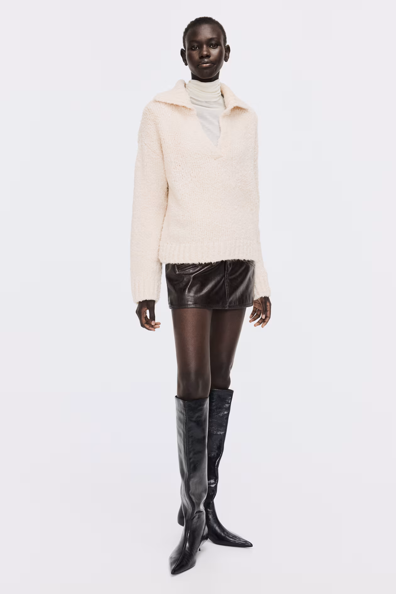 Oversized sweater in a bouclé knit. Open collar, V-shaped opening at front, dropped shoulders, and long sleeves. Ribbing at collar, cuffs, and hem.