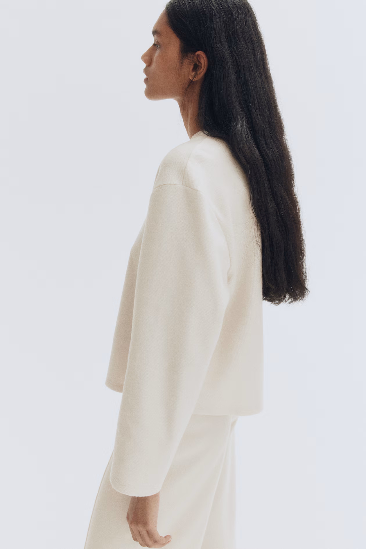 Short, oversized sweatshirt in jersey with a soft, brushed finish. Round, ribbed neckline, dropped shoulders, and long sleeves.