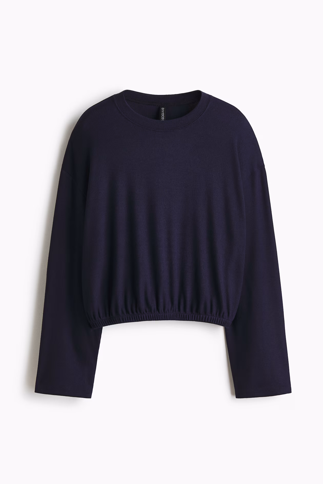 Oversized top in jersey. Ribbed round neckline, dropped shoulders, and long sleeves. Gathers and covered elastic at hem.