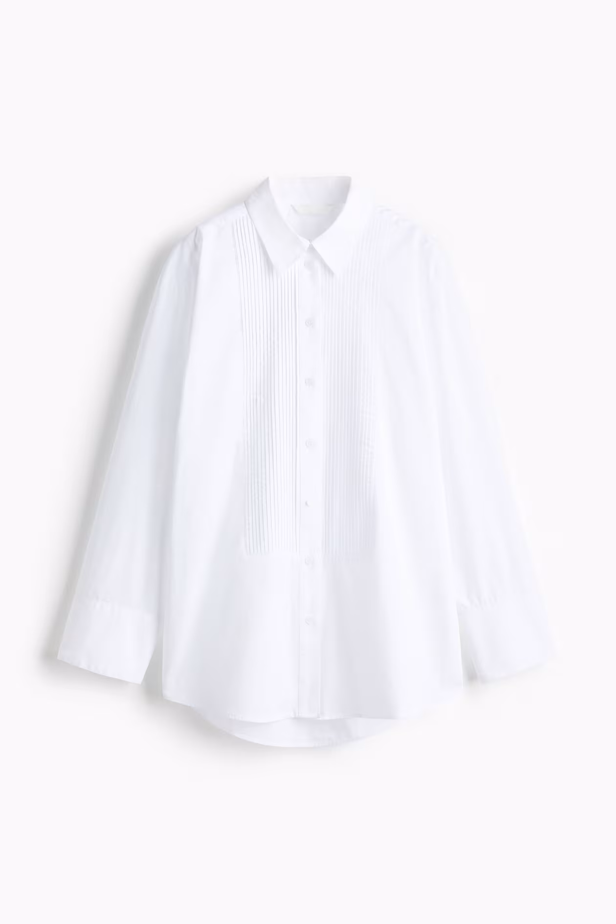 Shirt in crisp cotton poplin with a collar and buttons down the front. Pintucked front, yoke with a box pleat at the back, gently dropped shoulders and long sleeves with buttoned cuffs. Rounded hem. Slightly longer at the back.