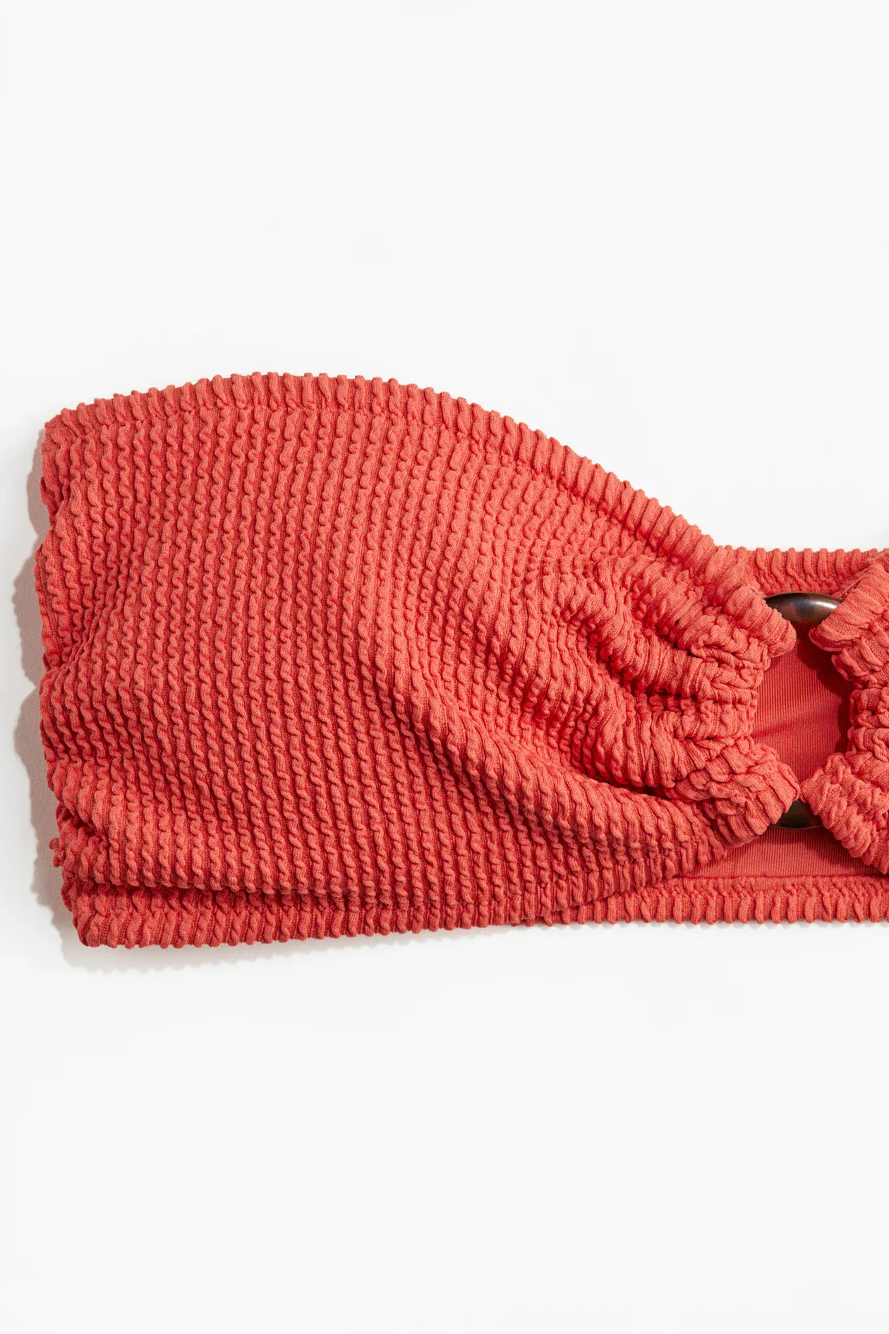 Lined bandeau bikini top. Silicone trim inside upper edge, cups with removable inserts for shaping and good support, a decorative plastic ring at center bust, and boning in sides. No fasteners.