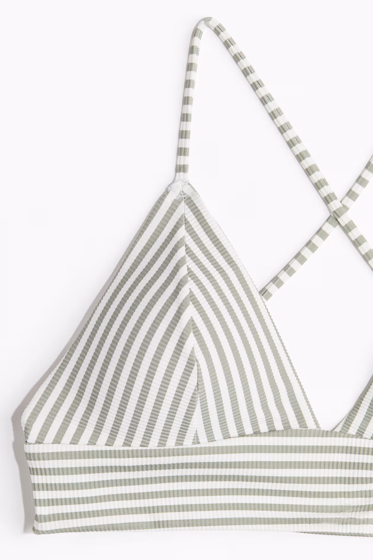Lined, soft-cup bikini top. Narrow, adjustable shoulder straps crossed at back, triangular cups with removable inserts for shaping and good support, and no fasteners.