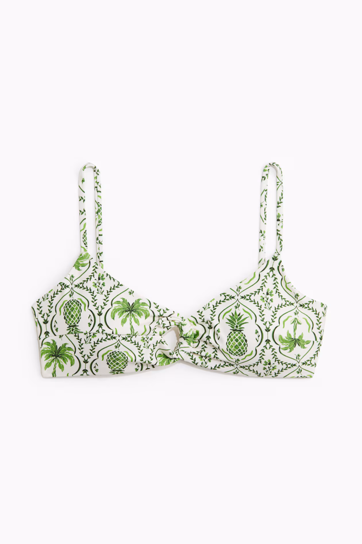 Lined, soft-cup bikini top with a small opening at front. Adjustable shoulder straps, padded cups with removable inserts for shaping and good support, and adjustable hook fastening at back.