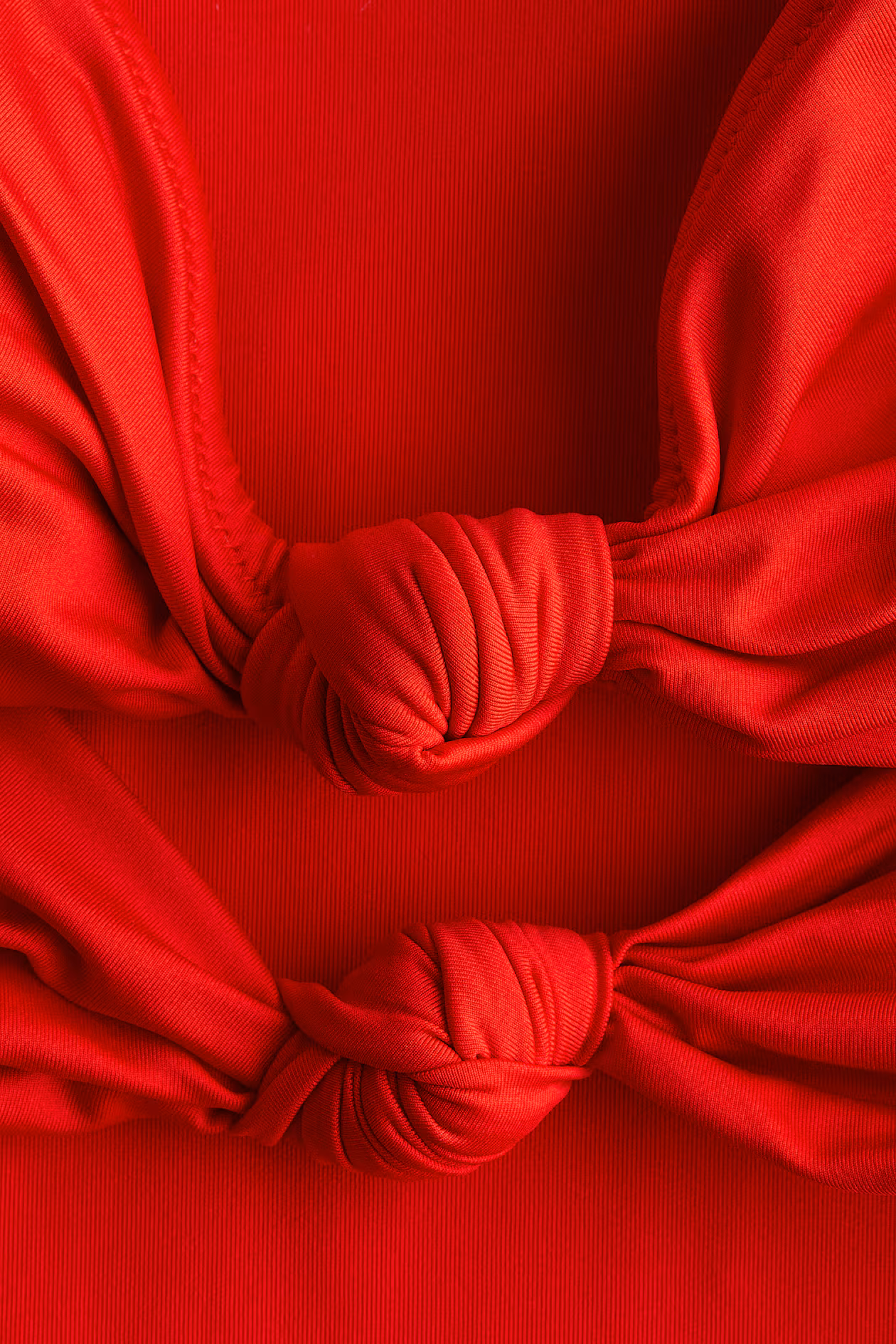 Fully lined bandeau swimsuit. Silicone trim inside upper edge to keep swimsuit in place, cutout sections and knotted details at front, and cups with removable inserts for shaping and good support. High-cut legs and medium coverage at back.