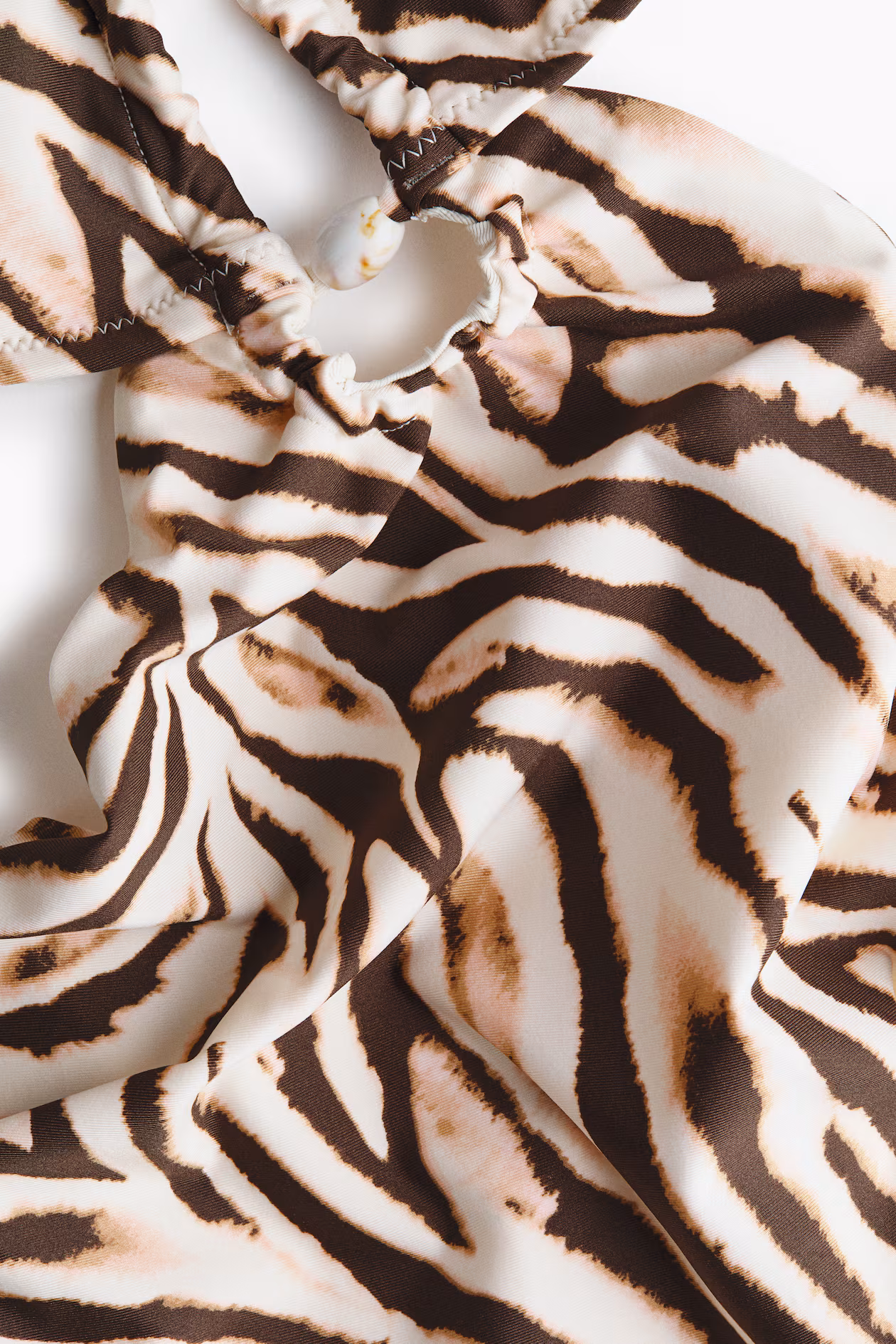 Fully lined halterneck swimsuit. Bead-embellished crossover drawstring at front to tie at back of neck, padded cups with removable inserts for shaping and good support, and a V-shaped opening at front. Cutout section at sides, open back with narrow ties, and high-cut legs. Cutaway coverage at back.
