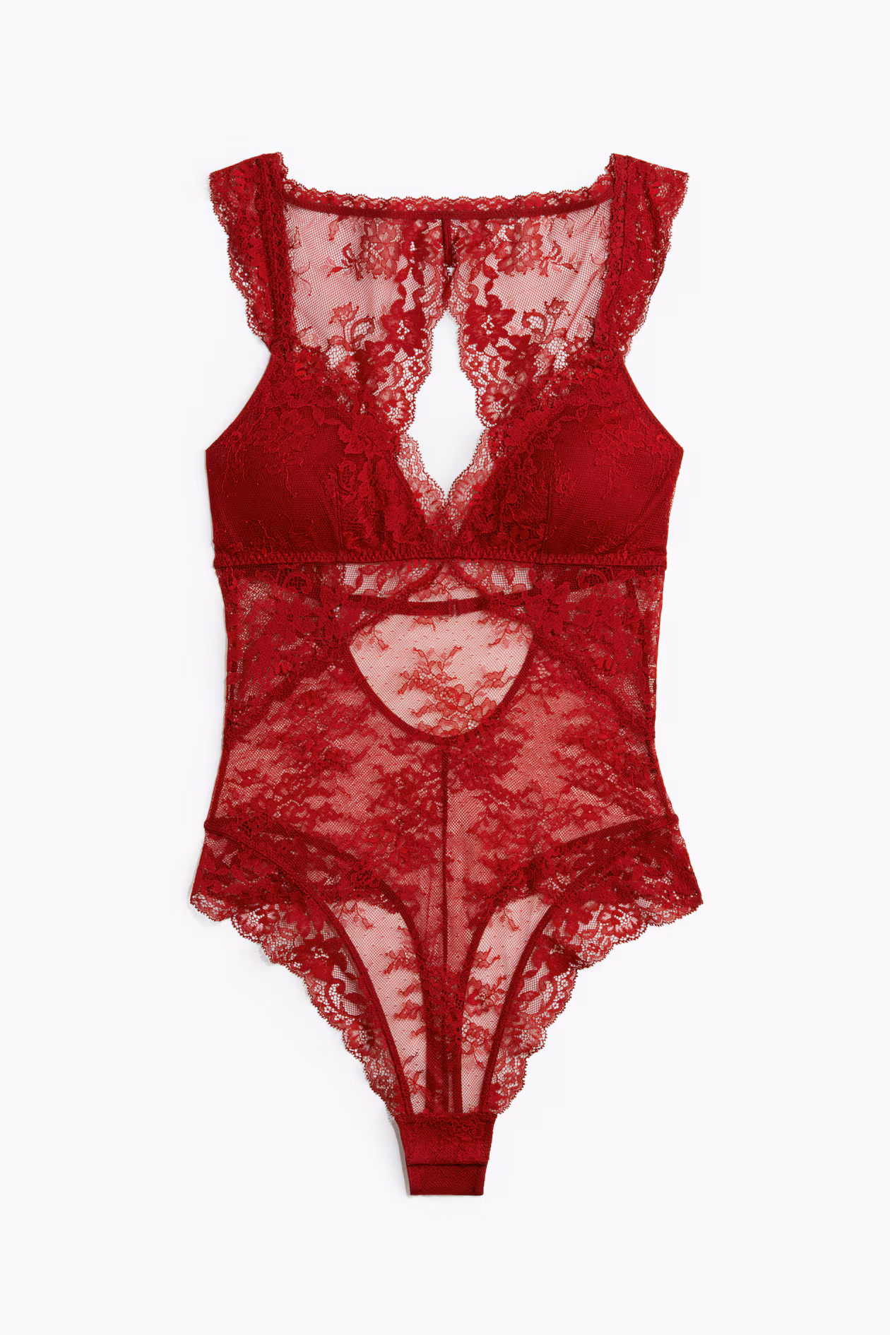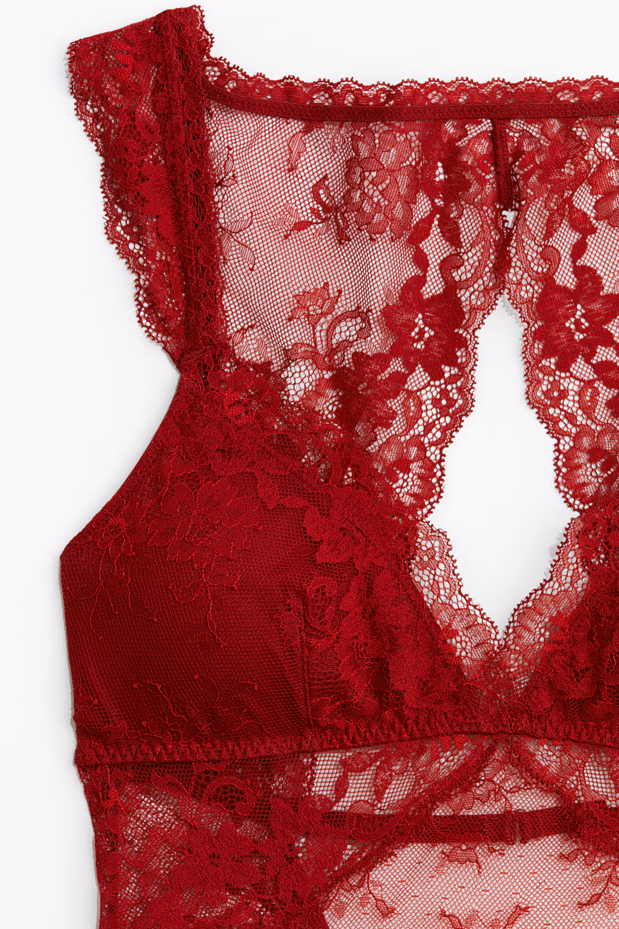 Soft-cup thong bodysuit in lace. V-neck, padded cups for shaping and good support, narrow, and elasticized trim below bust. Open section at back, hook fastening at back, and a lined gusset with concealed snap fasteners.