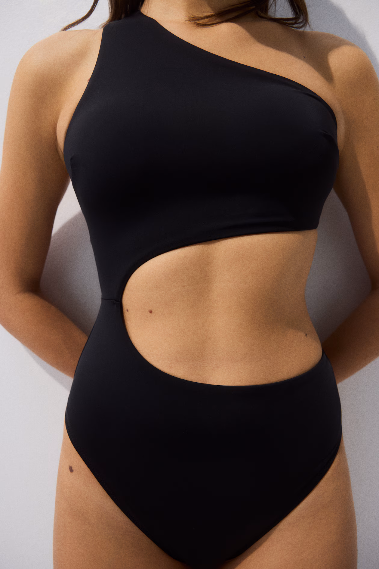 Fully lined, one-shoulder swimsuit with a cutout section at waist. Cups with removable inserts for shaping and good support, high-cut legs, and cutaway coverage at back.