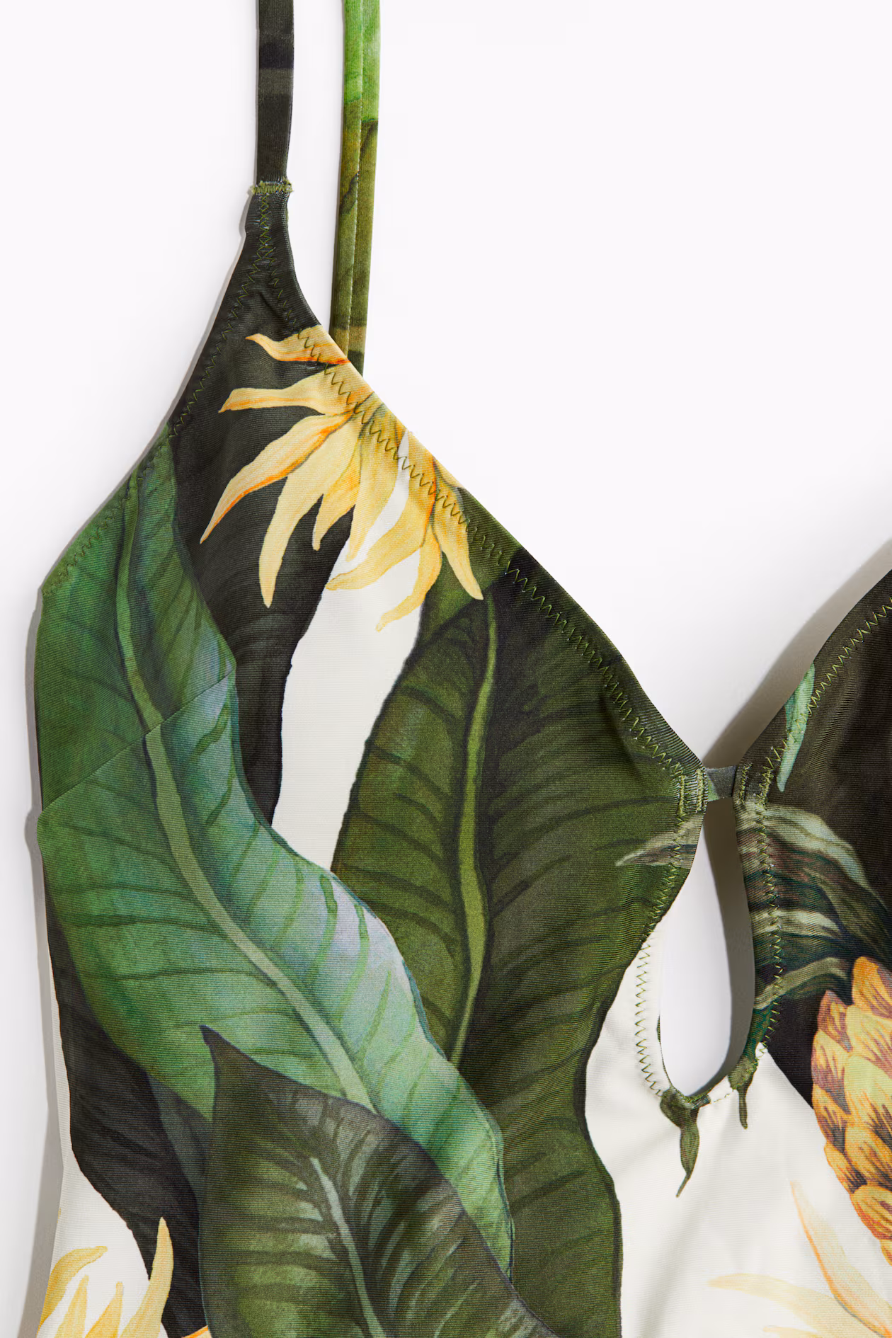 Fully lined, V-neck swimsuit with a small cutout at front. Narrow shoulder straps that thread through small loops and tie at back, cups with removable inserts for shaping and good support, and medium coverage at back.