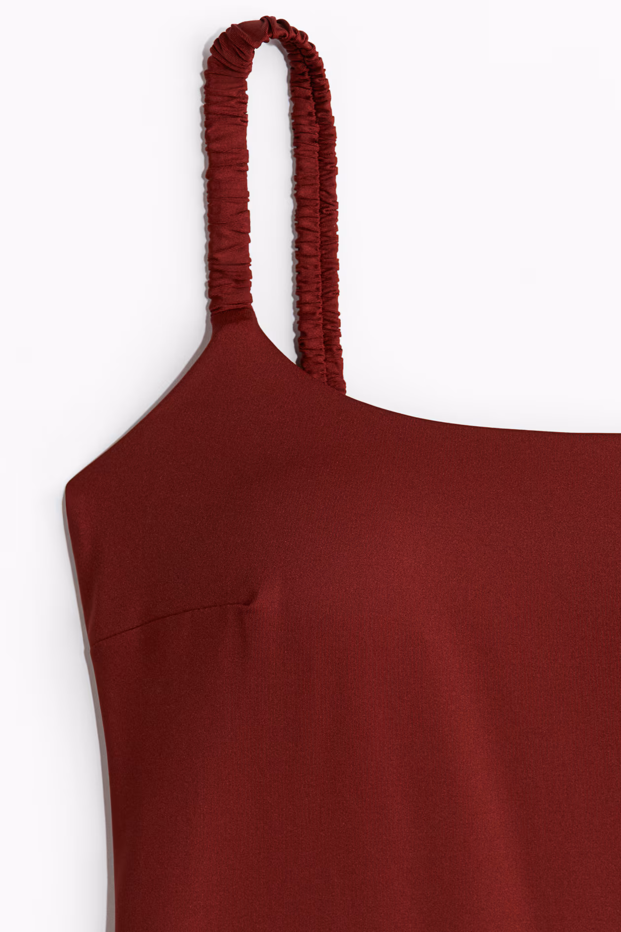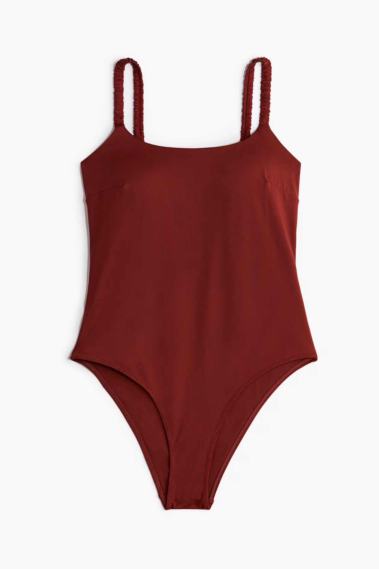 Fully lined swimsuit. Ruched, elasticized shoulder straps, cups with removable inserts for shaping and good support, and medium coverage at back.