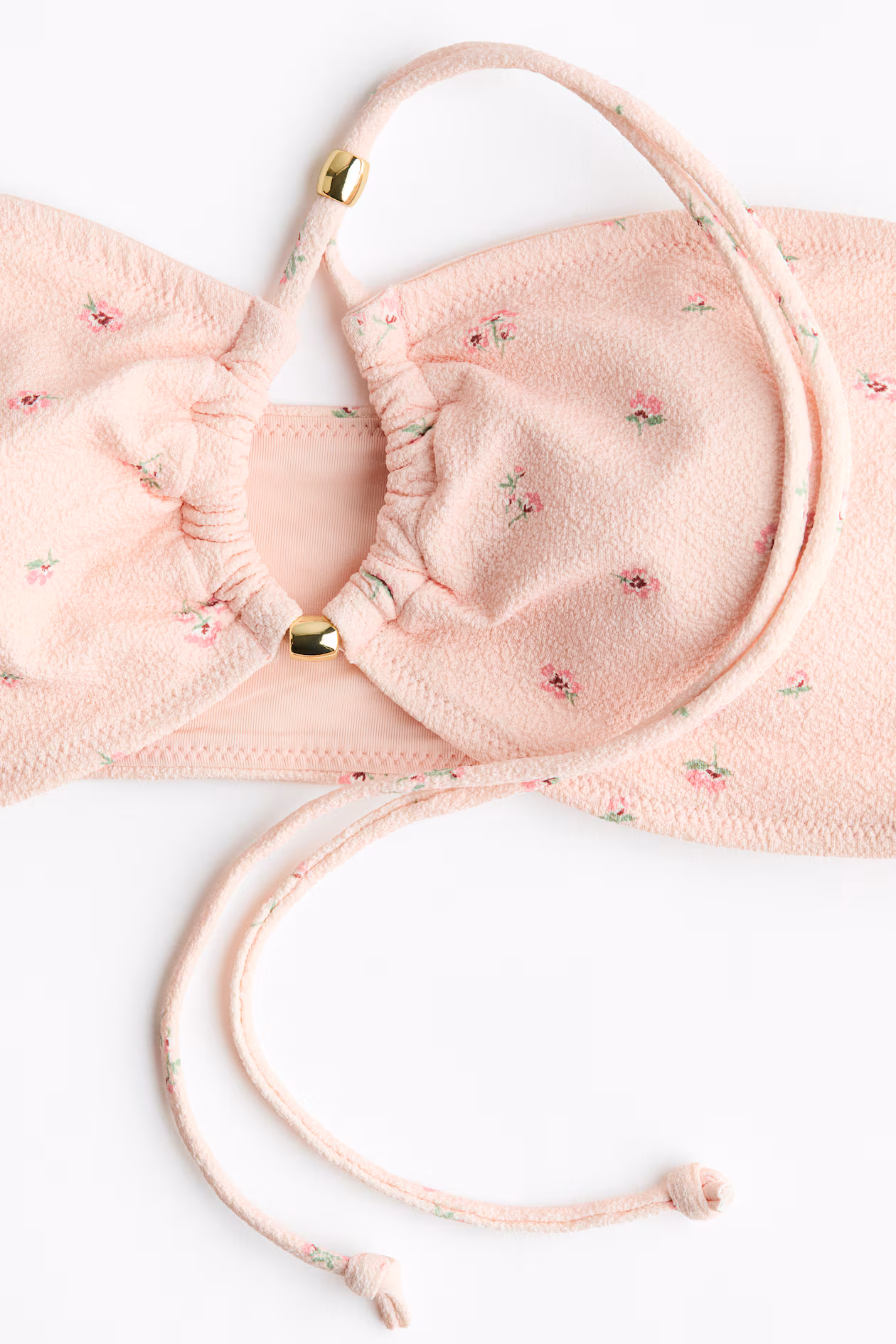 Lined, soft-cup bikini top. Narrow halterneck ties threaded through casing at center bust, creating a ruched effect. Cups with removable inserts for shaping and good support, boning in sides, and no fasteners.