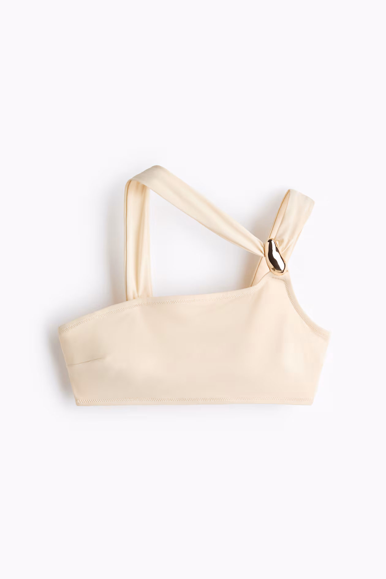 Lined, soft-cup bikini top with an asymmetric neckline. Double shoulder straps on one shoulder with a metal detail at front. Cups with removable inserts for shaping and good support. No fasteners.