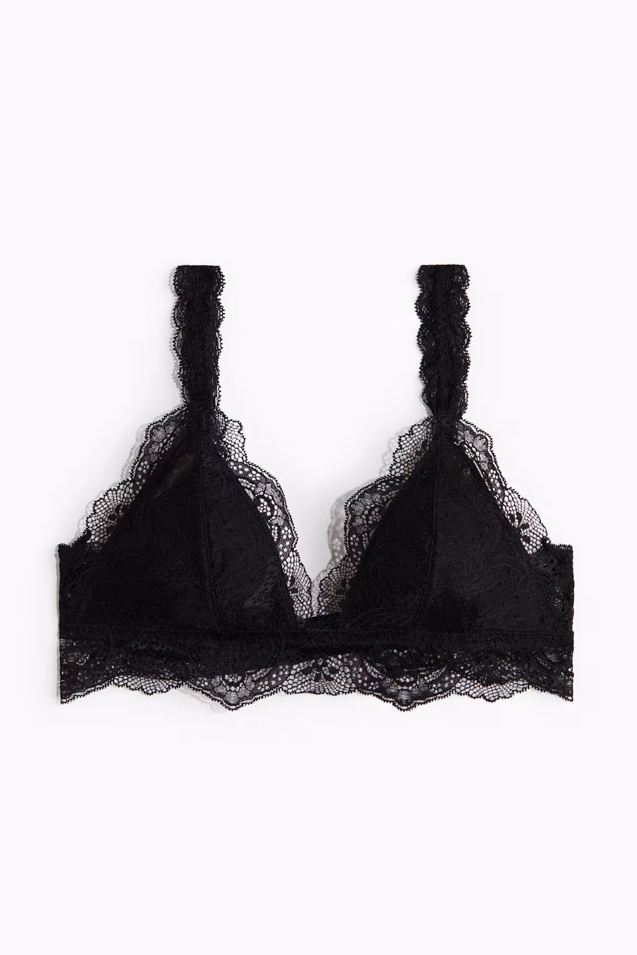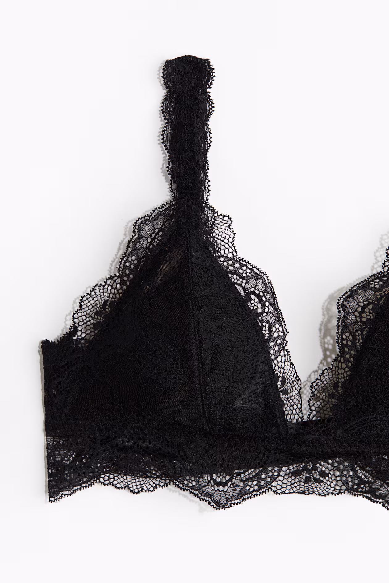 Soft-cup bra in lace. Adjustable shoulder straps, mesh-lined cups with removable inserts for shaping and good support, and hook-and-eye fasteners at back.