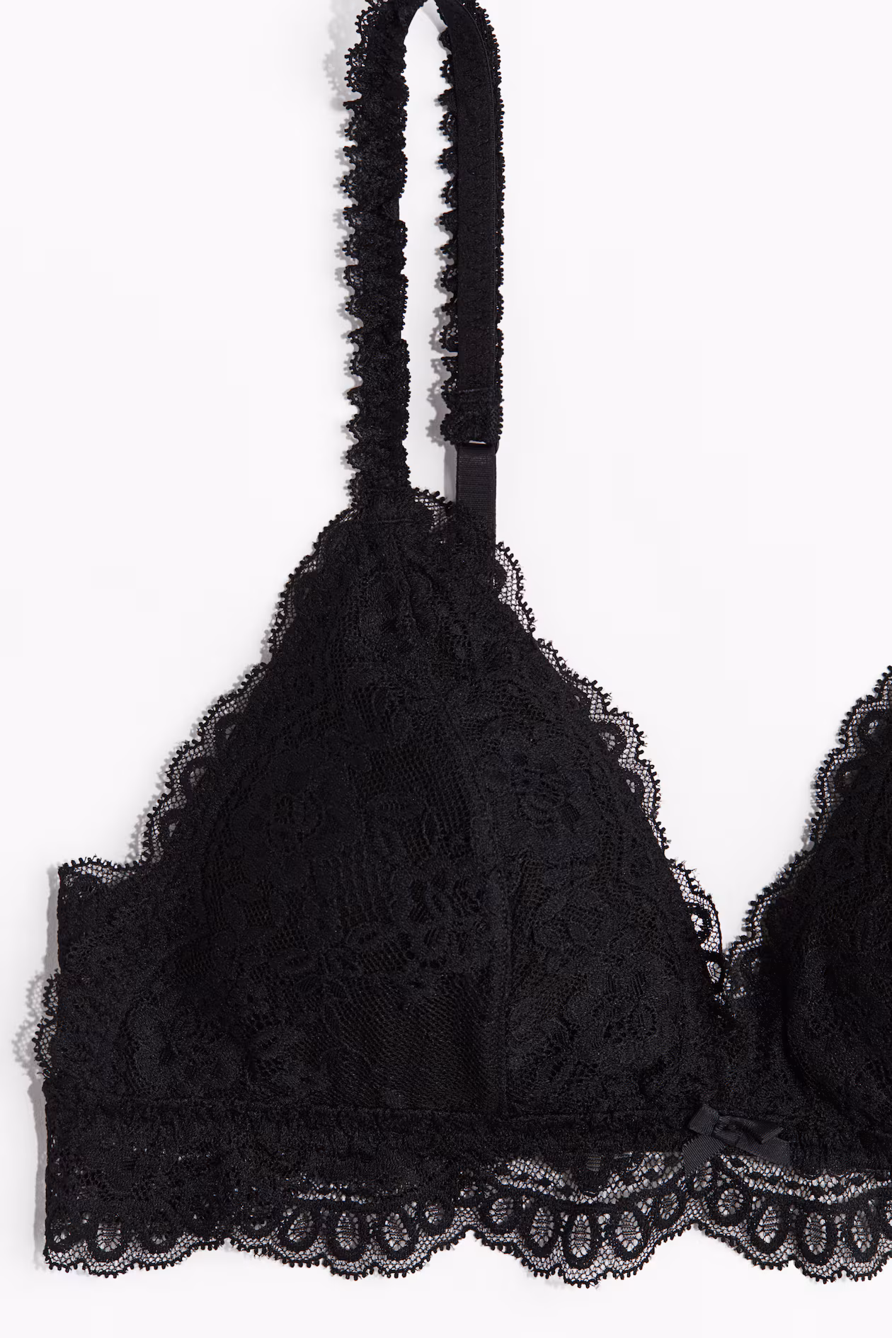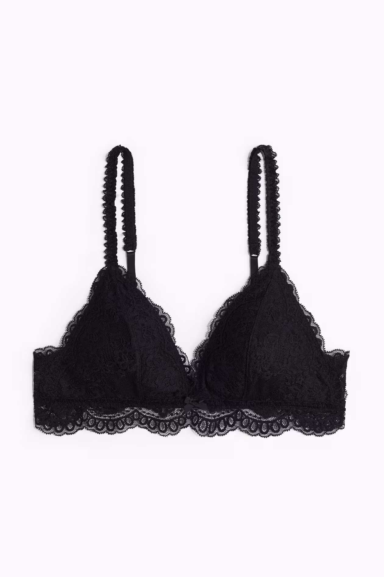 Soft-cup bra in lace. Adjustable shoulder straps, mesh-lined cups with removable inserts for shaping and good support, and hook-and-eye fasteners at back.