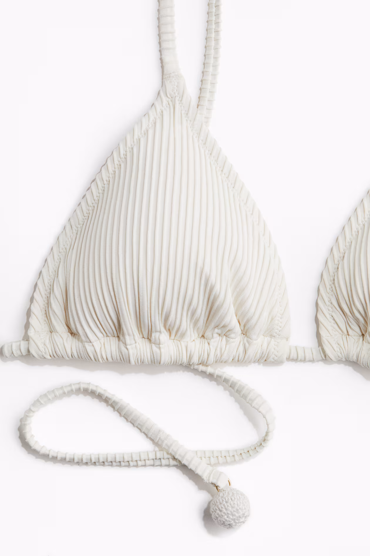 Lined triangle bikini top in ribbed fabric. Narrow, adjustable shoulder straps, cups with removable inserts for shaping and good support, and ties at back with crochet-look beads.