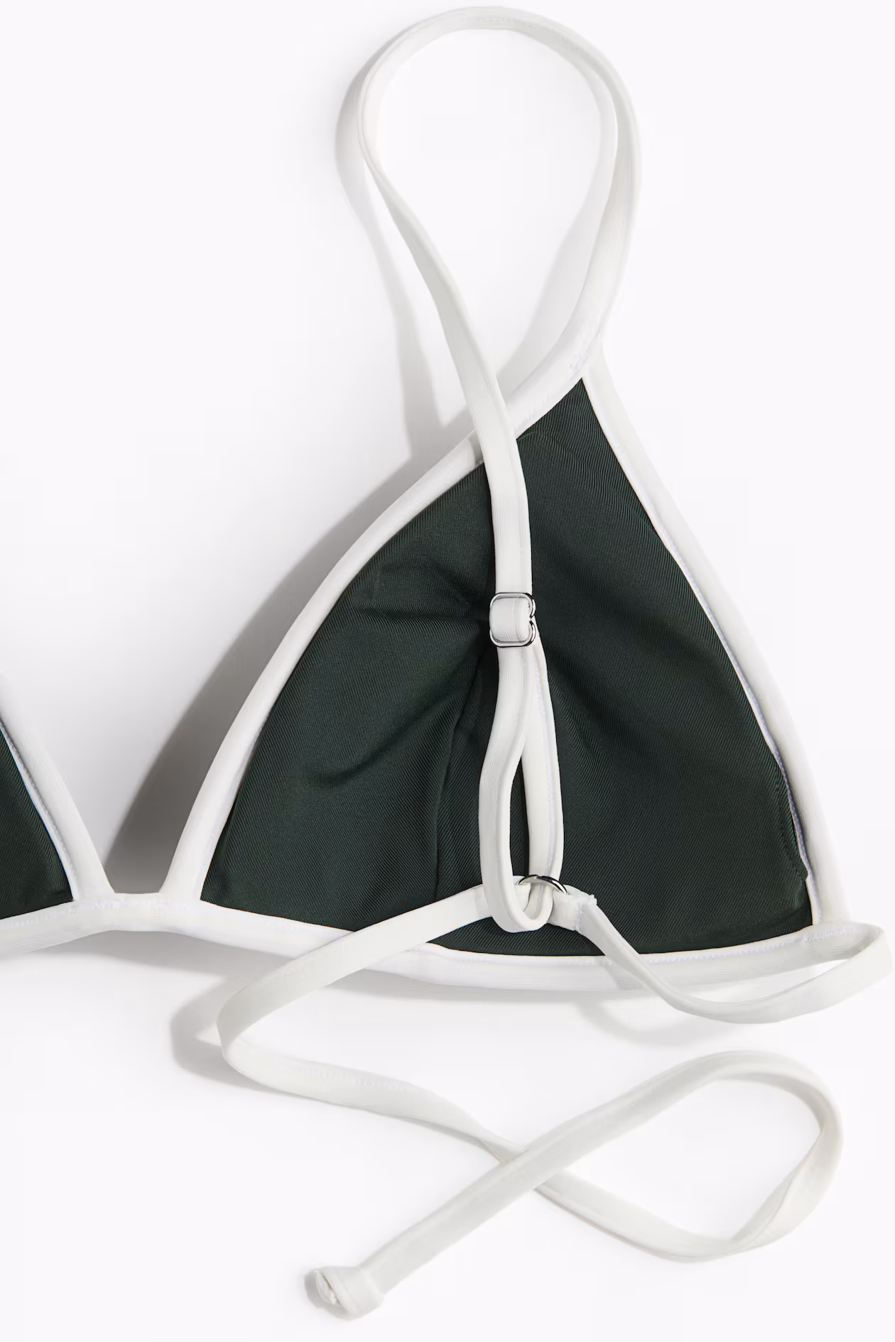 Lined, soft-cup triangle bikini top. Narrow, adjustable shoulder straps, ties at back, and lightly padded cups with removable inserts for shaping and good support.