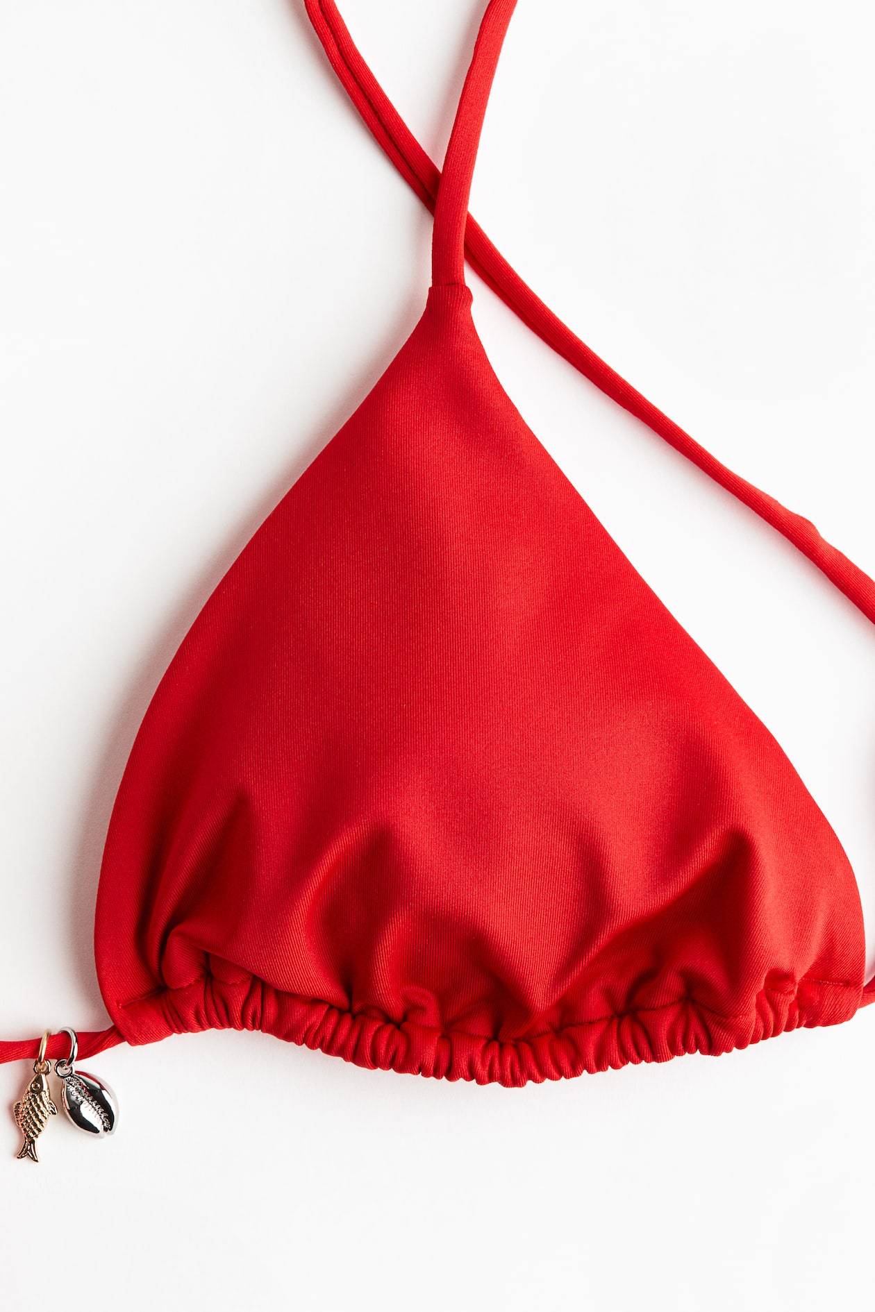 Lined triangle bikini top. Adjustable shoulder straps with ties threaded through loops at back. Cups with removable inserts for shaping and good support.