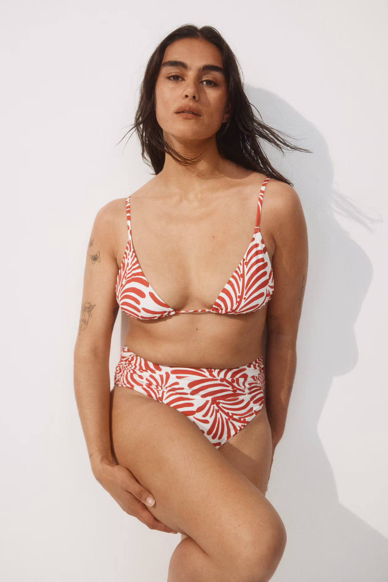 Lined, soft-cup triangle bikini top. Narrow, adjustable shoulder straps, ties at back, and cups with removable inserts for shaping and good support.