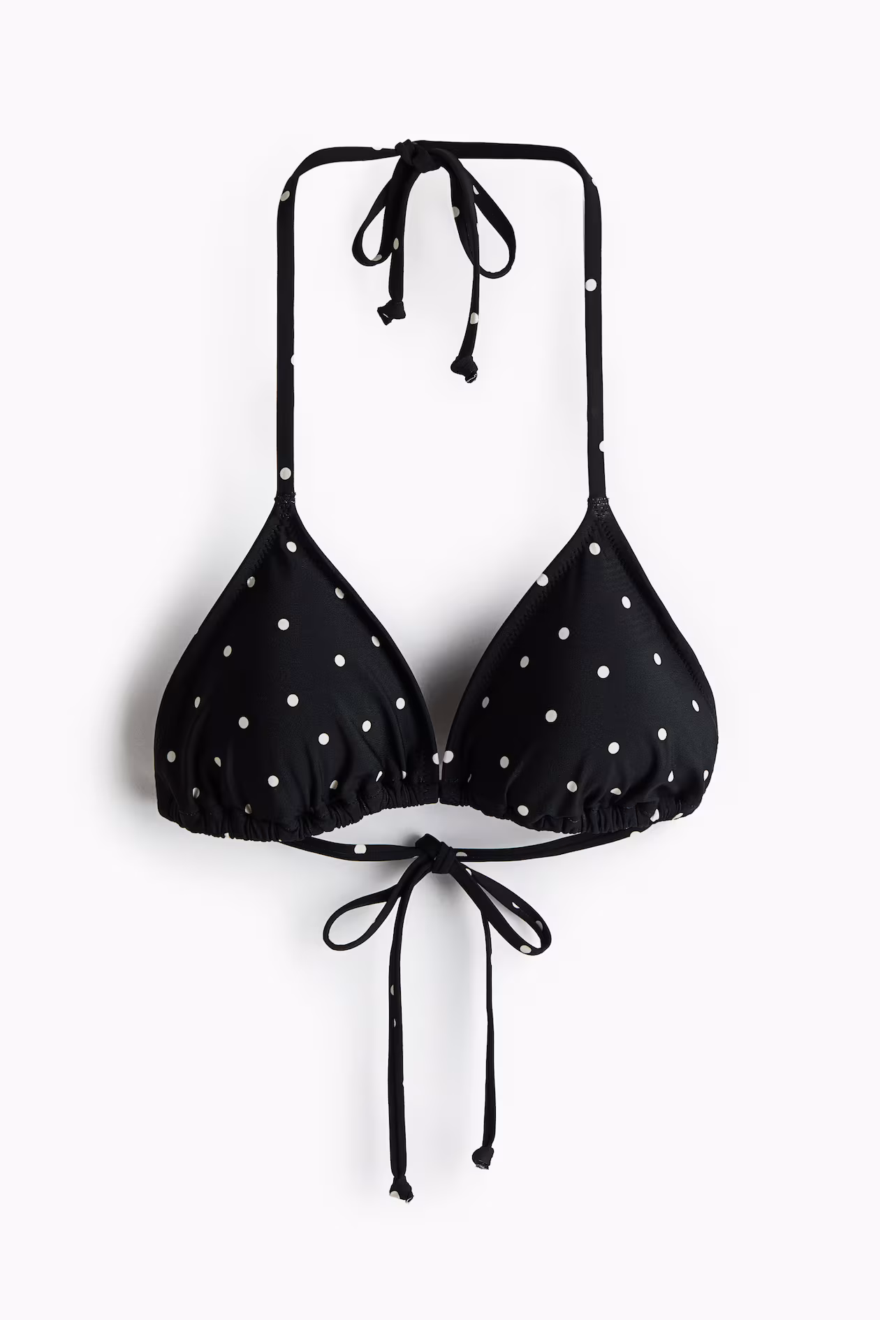 Lined triangle bikini top. Cups with removable inserts for shaping and good support. Ties at back of neck and at back.