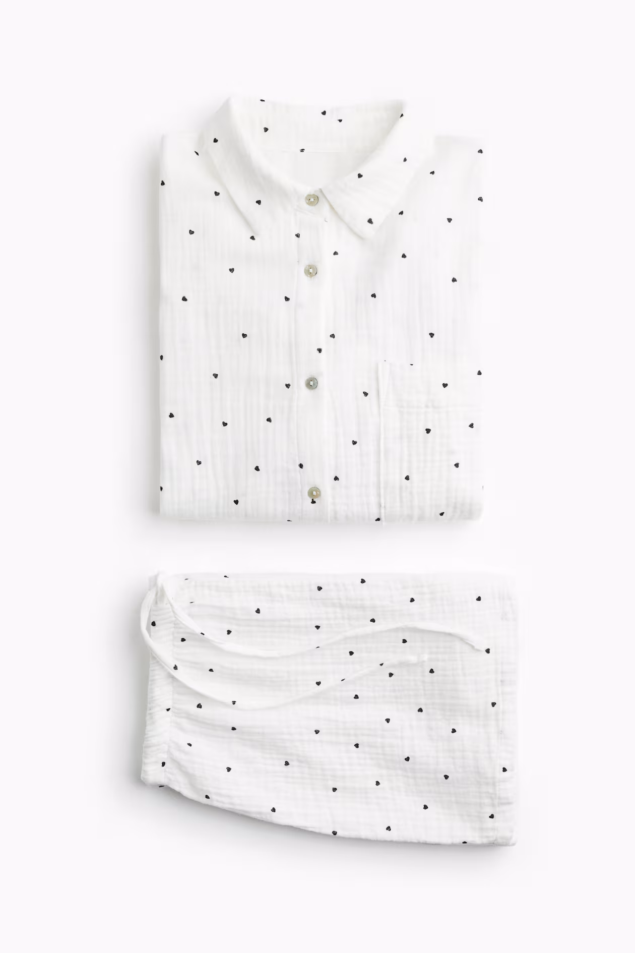 Pajama shirt and shorts in soft cotton muslin. Long-sleeved shirt with a collar, buttons at front, and a patch chest pocket. Shorts with elasticized, drawstring waistband.